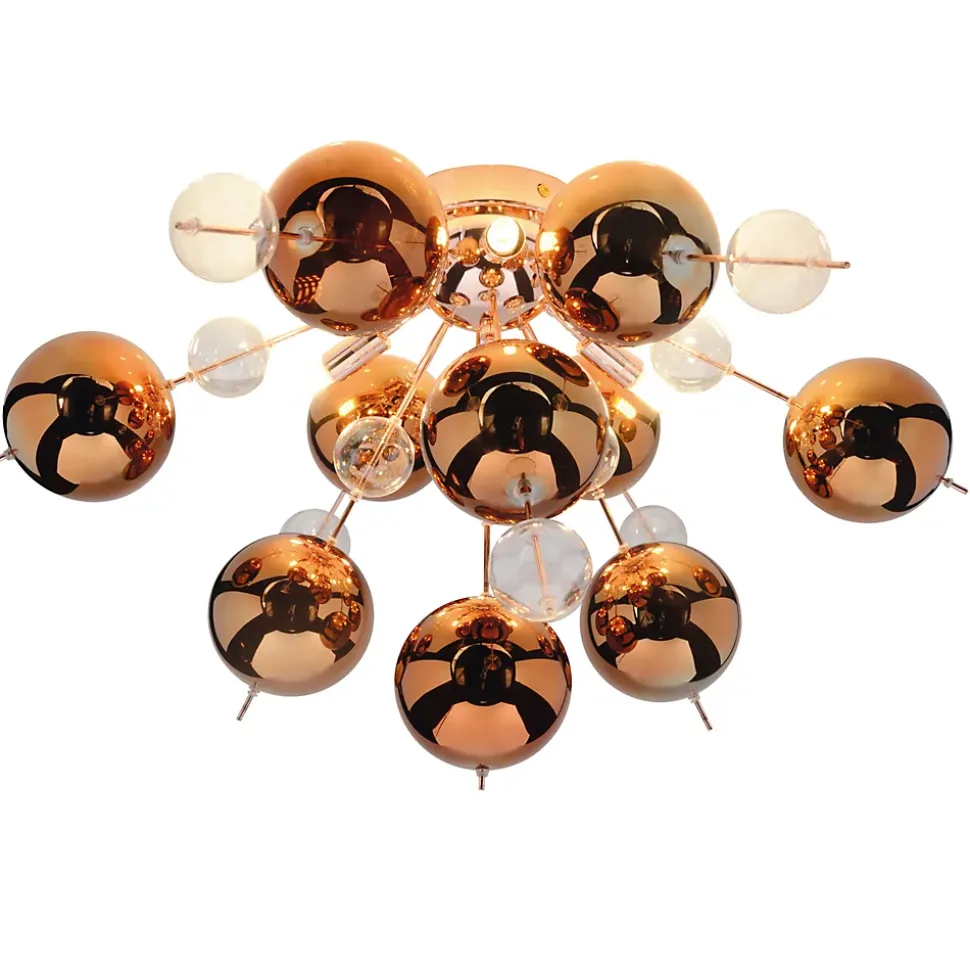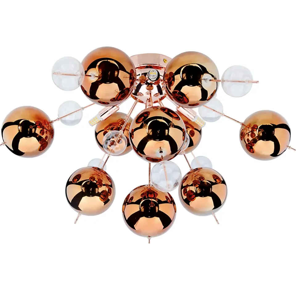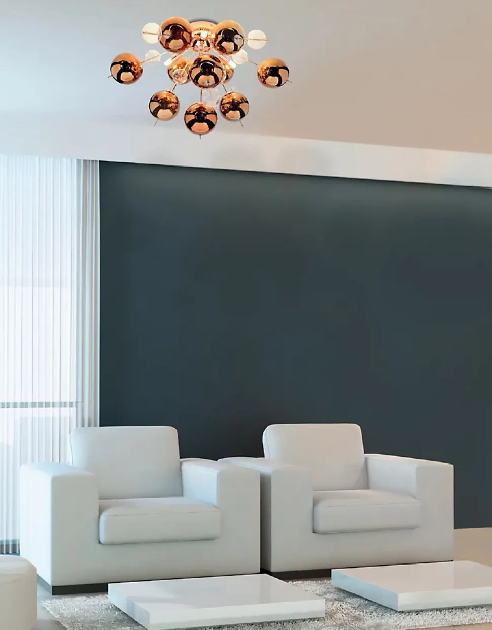 Donnez à votre intérieur ce petit quelque chose en plus avec le plafonnier EXPLOSION. Un plafonnier permet d’éclairer une pièce de manière uniforme. Il diffuse largement la lumière, ce qui permet de faire briller chaque coin de la pièce et de créer une atmosphère accueillante et lumineuse. Un style moderne, une conception semi-circulaire et un look extravagant, idéal pour ceux qui aiment l’extravagance et la qualité ! Le luminaire en métal et en verre est cuivré et attire le regard dans chaque pièce… L’association de la structure chromée et de l’abat-jour chromé donne un ensemble très esthétique. Les dimensions du plafonnier sont de 57 cm de longueur, 57 cm de largeur et 38 cm de hauteur. Le luminaire a donc un diamètre de 57 cm. Avec ce plafonnier, vous disposez d’une belle possibilité d’éclairage pour vos pièces d’habitation. Équipé de 6 culots G3 (à équiper selon vos souhaits avec des ampoules adaptées), il éclaire l’obscurité de manière attrayante. Vous pouvez changer vous-même l’ampoule, ce qui vous fait gagner du temps et de l’argent. Ce luminaire correspond à la classe 2. Pour le fonctionnement sur secteur de cet appareil, une tension de 220-240V ~ 50Hz est nécessaire. Une puissance totale de 168 watts assure un éclairage lumineux et efficace sur le plan énergétique dans l’espace de vie. Nos plafonniers de haute qualité assurent une ambiance lumineuse optimale et confèrent à votre maison confort et style dans chaque pièce.