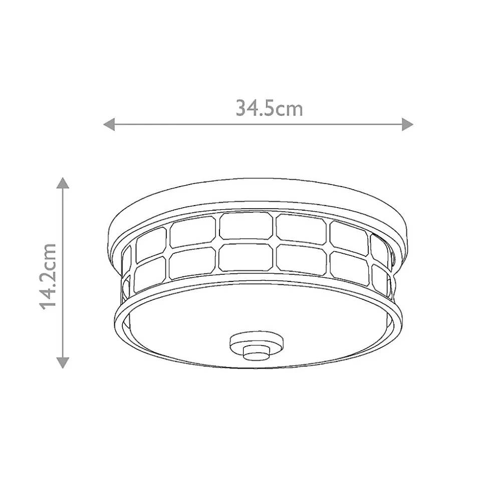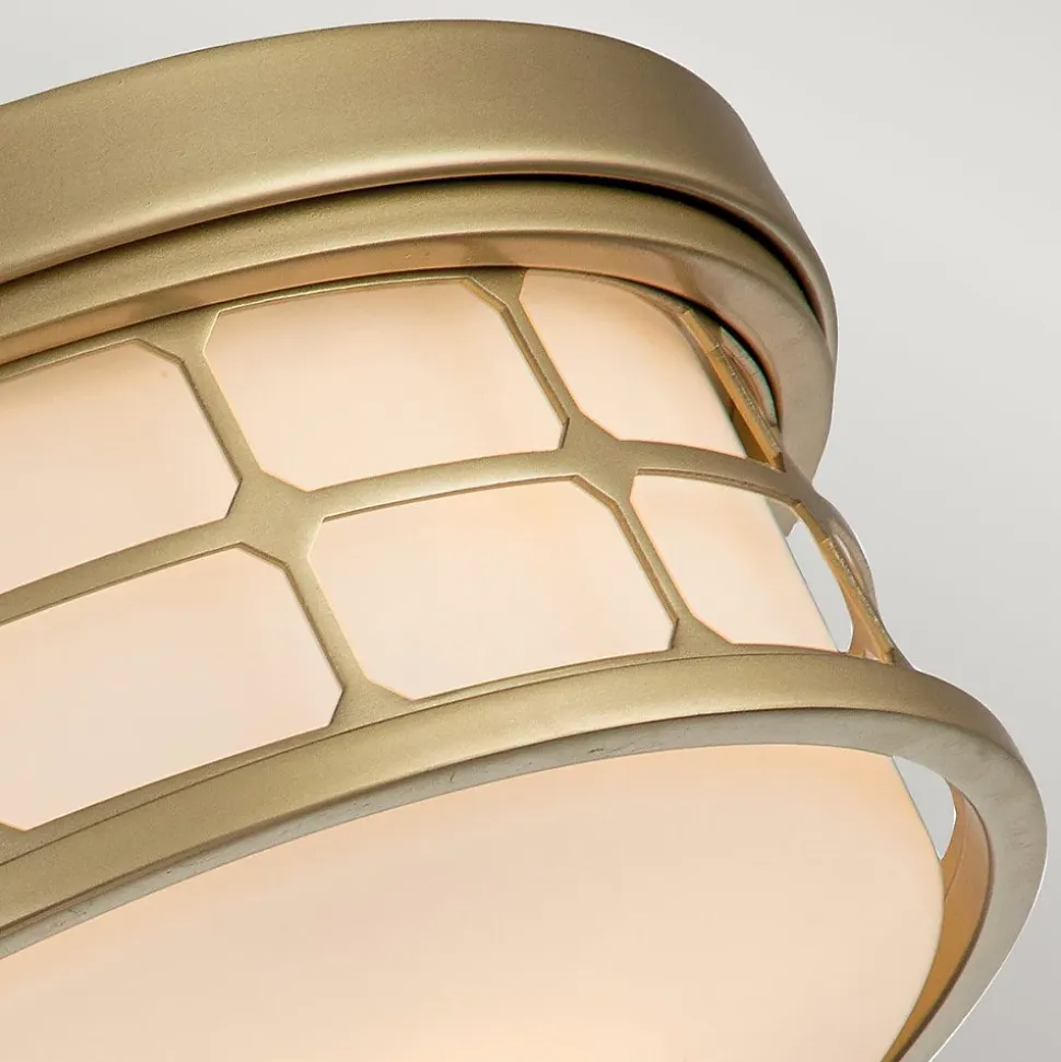 Le luminaire encastré Guardian 3 lumières présente une magnifique cage géométrique dans une finition en laiton naturel peint avec un abat-jour en verre opale. Il est classé IP44 pour les salles de bains.