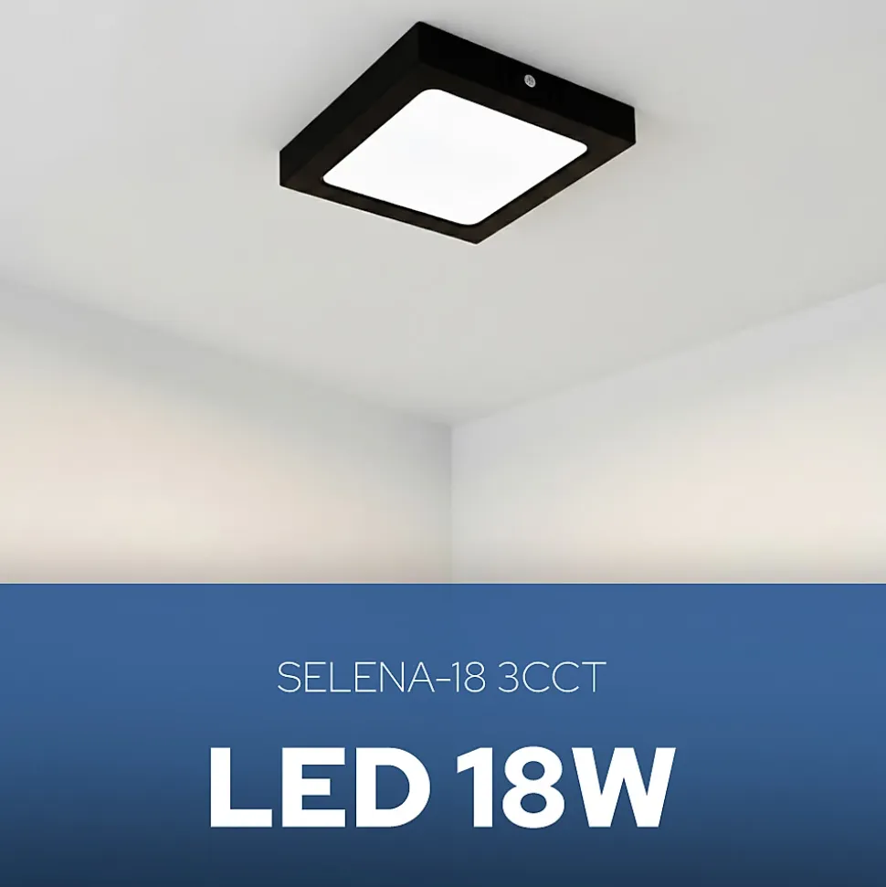 Plafonnier LED 18W 1660 lm 3CCT IP20 carré noir SELENA | HOROZLe plafonnier HOROZ SELENA 18W est un éclairage LED élégant, économe en énergie et fonctionnel, conçu pour les intérieurs modernes ainsi que pour les espaces professionnels.Il est idéal pour les couloirs, halls d’entrée, chambres, cuisines, bureaux ou locaux commerciaux — partout où un éclairage fiable et esthétique est nécessaire.Son boîtier carré et minimaliste apporte une touche contemporaine à votre intérieur et s’intègre harmonieusement dans des aménagements clairs ou foncés. Sa conception fine en fait un élément discret qui souligne le style de la pièce sans dominer l’espace.Paramètres techniques :✔️Type d’installation : En saillie✔️Application : Intérieur✔️Tension : 160–265V✔️Puissance : 18W✔️Flux lumineux : 1660 lm✔️Efficacité lumineuse : 92 lm/W✔️Température de couleur : 3CCT (3000K / 4000K / 6500K)✔️Indice de rendu des couleurs : >Ra70✔️Angle de diffusion : 120°✔️Matériau : Plastique (PC)✔️Classe de protection : II✔️Indice de protection : IP20✔️Dimmable : Non✔️Temps d’allumage : 15 000Dimensions :✔️Largeur : 173 mm✔️Hauteur : 32 mm