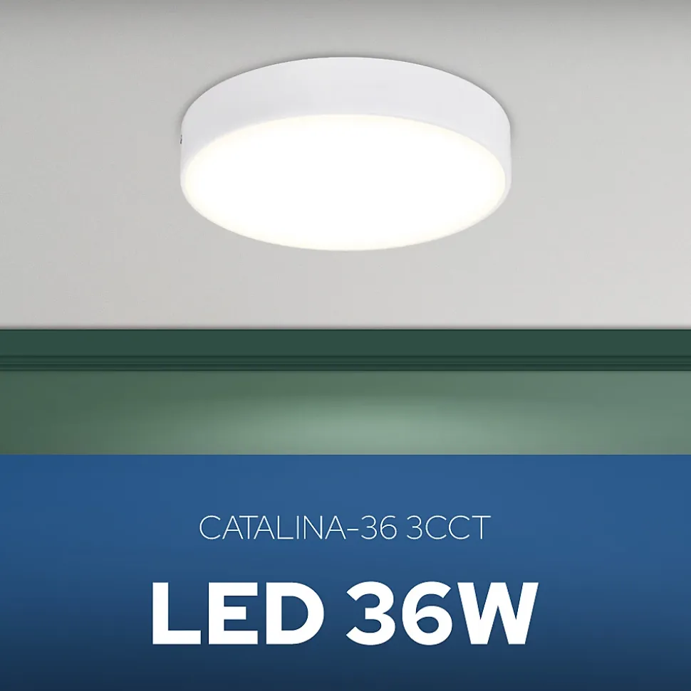 Plafonnier LED en saillie 36W 3600lm 3CCT IP20 rond blanc CATALINA | HOROZ |Le plafonnier HOROZ CATALINA 36W est un éclairage LED élégant, économe en énergie et performant, conçu pour les intérieurs modernes ainsi que pour les espaces professionnels.Il est idéal pour les couloirs, halls d’entrée, chambres, cuisines, bureaux ou locaux commerciaux — partout où un éclairage puissant, fiable et esthétique est nécessaire.Son boîtier rond et minimaliste apporte une touche contemporaine à votre intérieur et s’intègre parfaitement dans des aménagements clairs comme foncés. Sa conception fine permet au plafonnier de rester discret tout en soulignant le style de la pièce.Données techniques :✔️Série : CATALINA✔️Application : Intérieur✔️Type d’installation : En saillie✔️Couleur : Blanc✔️Source lumineuse incluse : Oui (SMD LED)✔️Tension : 160–265V✔️Puissance : 36W✔️Équivalent ampoule traditionnelle : 192W✔️Flux lumineux : 3600 lm✔️Efficacité lumineuse : 100 lm/W✔️Température de couleur : 3CCT (3000K / 4000K / 6500K sélectionnable)✔️Indice de rendu des couleurs : >Ra80✔️Matériau : Plastique (PC)✔️Classe de protection : II✔️Indice de protection : IP20✔️Dimmable : Non✔️Angle de diffusion : 120°✔️Temps d’allumage : 0,5Dimensions :✔️Diamètre : 295 mm✔️Hauteur : 38 mm