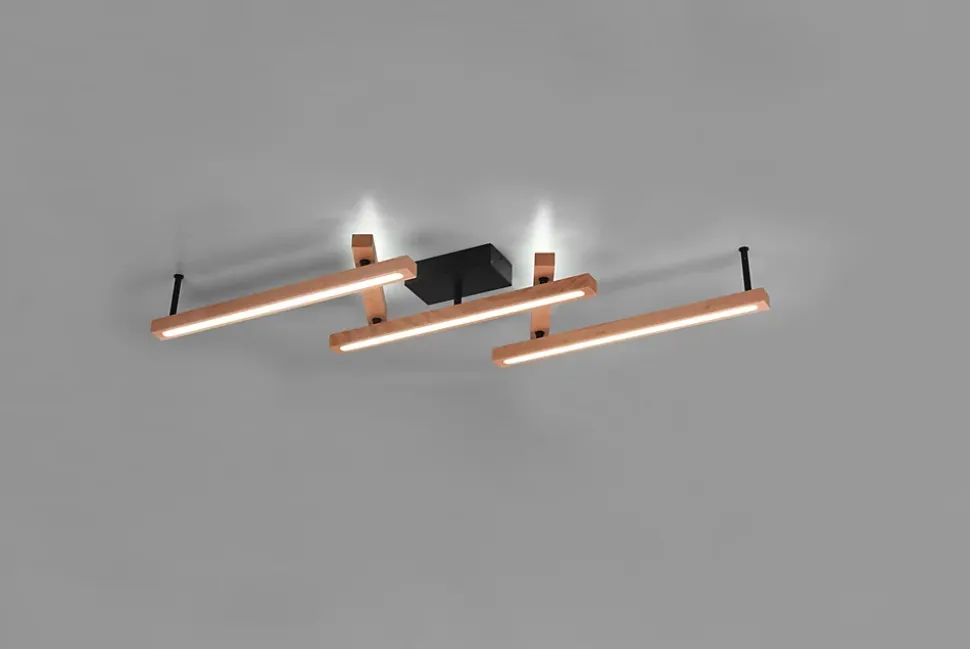 Bellari : Élégance et lumière ajustable pour tous vos espacesLe plafonnier Bellari de TRIO, avec sa finition élégante en bois naturel et métal noir mat, est conçu pour s’adapter à une variété d’intérieurs. Sa conception moderne, avec des lignes droites et un design épuré, apporte une touche contemporaine tout en restant chaleureuse grâce à l’association du bois clair et du métal.Un éclairage personnalisé et économiqueLa fonction de réglage continu de la luminosité et de la couleur, via la télécommande incluse, vous permet de créer l’ambiance parfaite à tout moment. Que vous souhaitiez une lumière chaude pour la détente ou une lumière plus froide pour une ambiance dynamique, le plafonnier Bellari offre une flexibilité totale pour s’adapter à vos besoins.Grâce à sa technologie LED moderne, il permet de réaliser jusqu’à 80 % d’économies d’énergie par rapport aux lampes halogènes traditionnelles. De plus, la LED assure une longue durée de vie, une faible émission de chaleur et contribue à préserver l’environnement.Caractéristiques techniquesType de montage : PlafonnierSource lumineuse : SMD LED (intégrée)Puissance : 36WLumen : 4200lmPlage de couleur de lumière : 2700K – 6000K (ajustable)Indice de rendu des couleurs (CRI) : > 80 CRIDesign : Bois naturel et métal noir matDimensions : 180 x 10 x 13,5 cmPoids : 0,031 kgTension de fonctionnement : 230V ~ 50HzIP20 – Convient à une utilisation intérieureCommande à distance incluseProduit pivotant avec lumière orientable vers le haut et le basOffrez à votre intérieur une lumière personnalisable, économe et moderne avec le plafonnier Bellari !