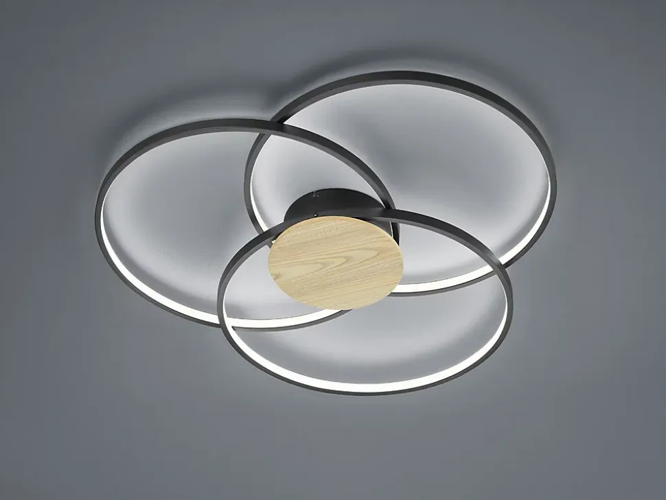 Les caractéristiques techniquesLe plafonnier Sedona de Trio se distingue par son design contemporain alliant aluminium noir mat et détails effet bois, pour un rendu chaleureux et moderne.Équipé d’une source LED SMD intégrée de 40 watts, ce luminaire délivre une lumière douce et indirecte de 4800 lumens avec une température de couleur de 3000K, idéale pour une ambiance cosy.Design et ambianceLes trois anneaux élégants créent un jeu subtil de lumière et d’ombre, baignant votre pièce dans une atmosphère harmonieuse.Grâce à son variator SWITCH intégré, vous pouvez régler l’intensité lumineuse en trois étapes simplement via un interrupteur classique, sans équipement spécial.Conseils d’utilisationCe plafonnier polyvalent peut être installé au plafond ou en applique murale, ce qui le rend adapté à divers espaces de vie.Sa technologie LED avancée permet de réduire jusqu’à 80 % la consommation d’énergie par rapport aux lampes halogènes traditionnelles, tout en offrant une longue durée de vie et une faible production de chaleur.