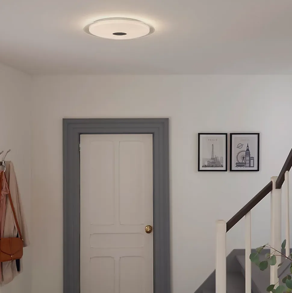 - Réglez la lumière à l’aide de votre interrupteur actuel. S’adapte à votre installation électrique actuelle. Aucun interrupteur spécifique n’est nécessaire. Appuyez une première fois sur l’interrupteur et l’ampoule s’allume dans une couleur neutre à une intensité de 100%, propice au travail. Appuyez une deuxième fois sur l’interrupteur et la lumière devient plus chaude à une intensité de 50%, propice à la détente. Appuyez une troisième fois sur l’interrupteur et la lumière s’éteint