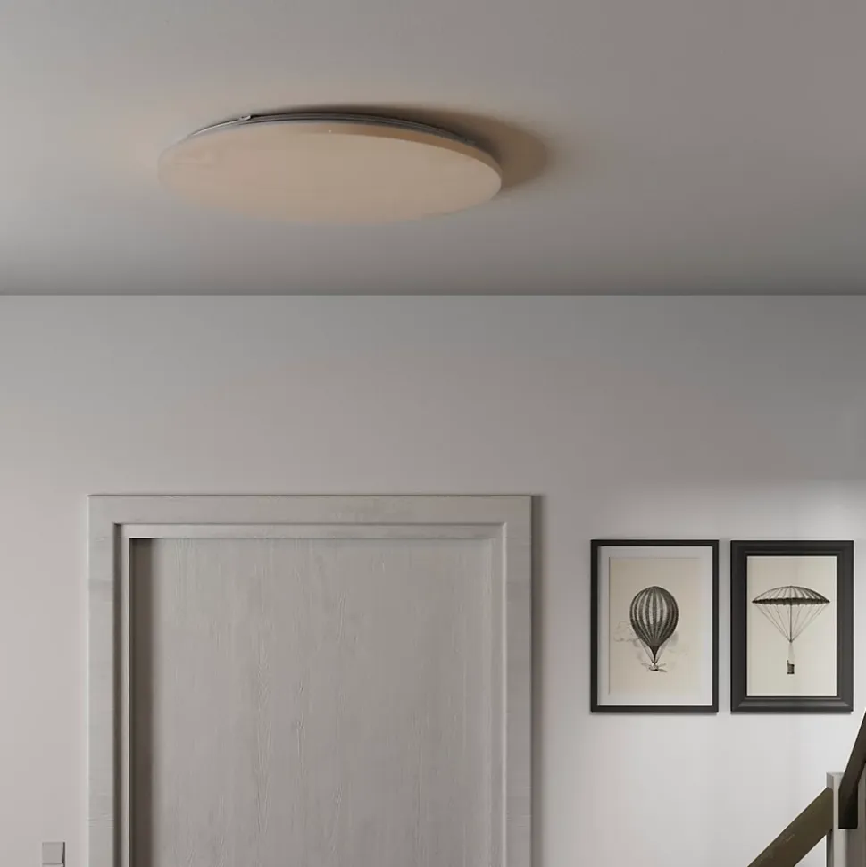 - Ce plafonnier comprend une télécommande pour adapter la lumière à l’utilisation : lumière neutre à 100% d’intensité propice au travail, blanc chaud à 30% d’intensité propice à la détente, etc.