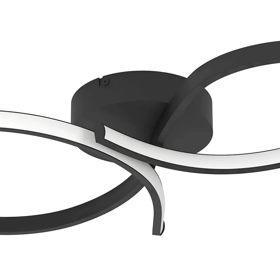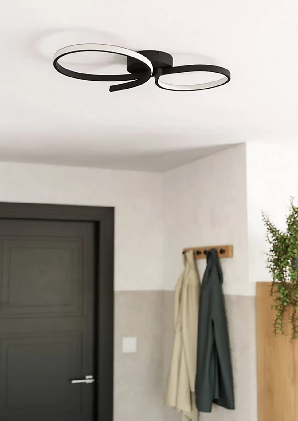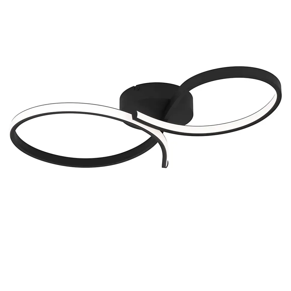 - Le plafonnier SERPINS est entièrement en acier noir. Son design se compose de deux boucles, équipées de LED intégrées protégées par un revêtement plastique blanc et diffusant une lumière blanc chaud très agréable. Il se placera facilement dans toutes les pièces de votre choix, il est compact car ne fait que 60 cm de long, il ne prendra pas de place au plafond mais vous sera très utile ! Dans une décoration moderne, ce type de design est parfait.