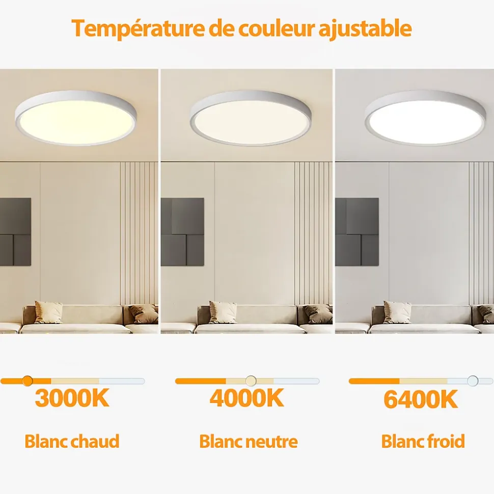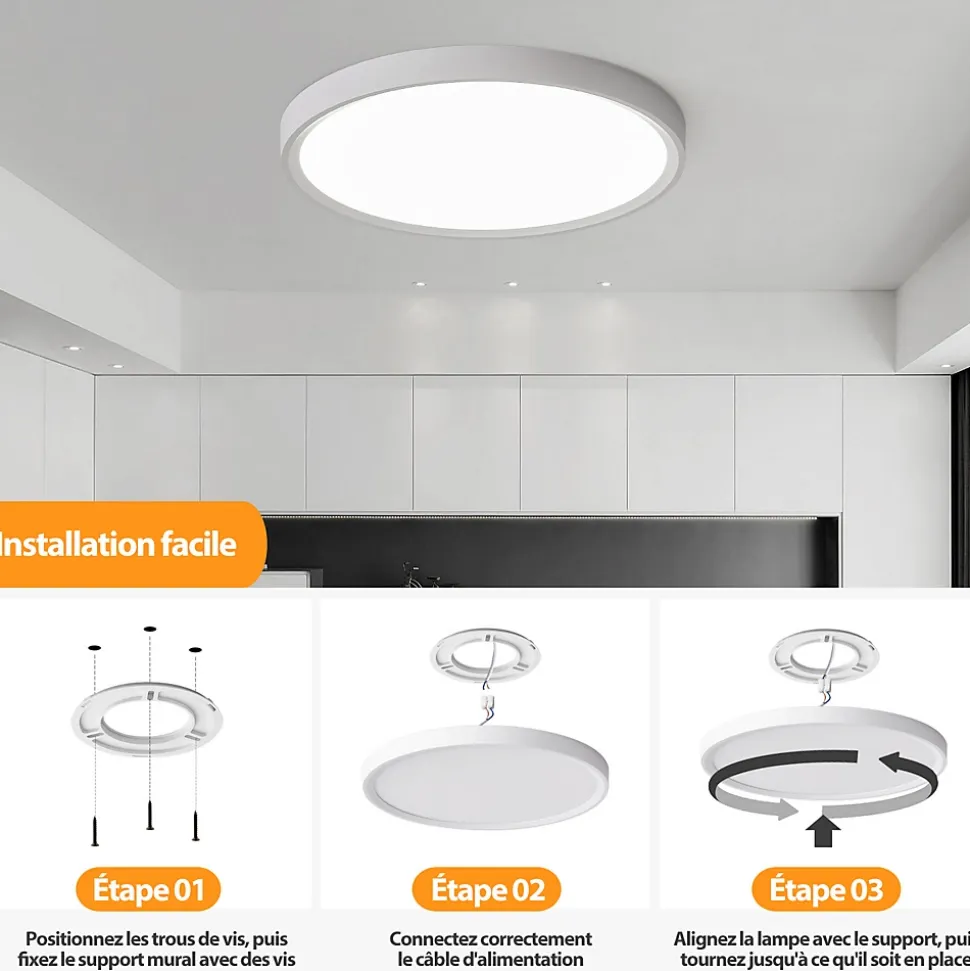 Température Réglable en Trois Couleurs : Ce plafonnier LED offrent une bonne luminosité de 1850 LM et trois températures de couleur différentes (3000K/4000K/6400K) pour créer l’ambiance parfaite selon vos besoins. Que vous ayez besoin d’une lumière chaude et cosy ou d’une lumière vive et énergisante, cette lampe s’adapte à la plupart des occasions.Design ultra Fin : Le corps de la lampe et le panneau LED sont tous en dépoli. Il ressente un design mince qui ajoute une touche d’élégance moderne à n’importe quel espace. il est léger, parfait pour le nettoyage, peut ce mettre sur un carre ou bien un plafond, dans la cuisine , salon, chambre, garage, couloirs, toilette, placards, cages d’escalier, vestiaires, chambres d’enfants, WC et bureaux.Lumière LED Douce Protection Vos Yeux : Le luminaire plafonnier offre une lumière douce et non éblouissante qui protège vos yeux des dommages potentiels. Le plafonnier a également un CRI de 80+, garantissant des couleurs précises et vives. Profitez d’une atmosphère chaleureuse et relaxante sans compromettre votre confort visuel.Installation Facile : L’installation est simple et peut être réalisée sans l’aide d’un électricien, grâce à la conception de la base qui s’adapte à 99% des boîtes de jonction. Le boîtier en PC de haute qualité assure une meilleure transmission de la lumière et une résistance aux chocs, rendant ce plafonnier à la fois sûr et durable. C’est un choix judicieux pour quiconque cherche un éclairage efficace et économique.Description Puissance : 18WTension : AC 165-265VFlux lumineux : 1850LmTempérature de lumière : CCT (3000K/4000K/6400K)Angle de diffusion : 120°Dimensions : ø230 H25mmIRC : >80RDurée de vie nominale : 15000hFréquence : 50/60HzIndice de protection : IP20Couleur : ORGarantie : 2 ans