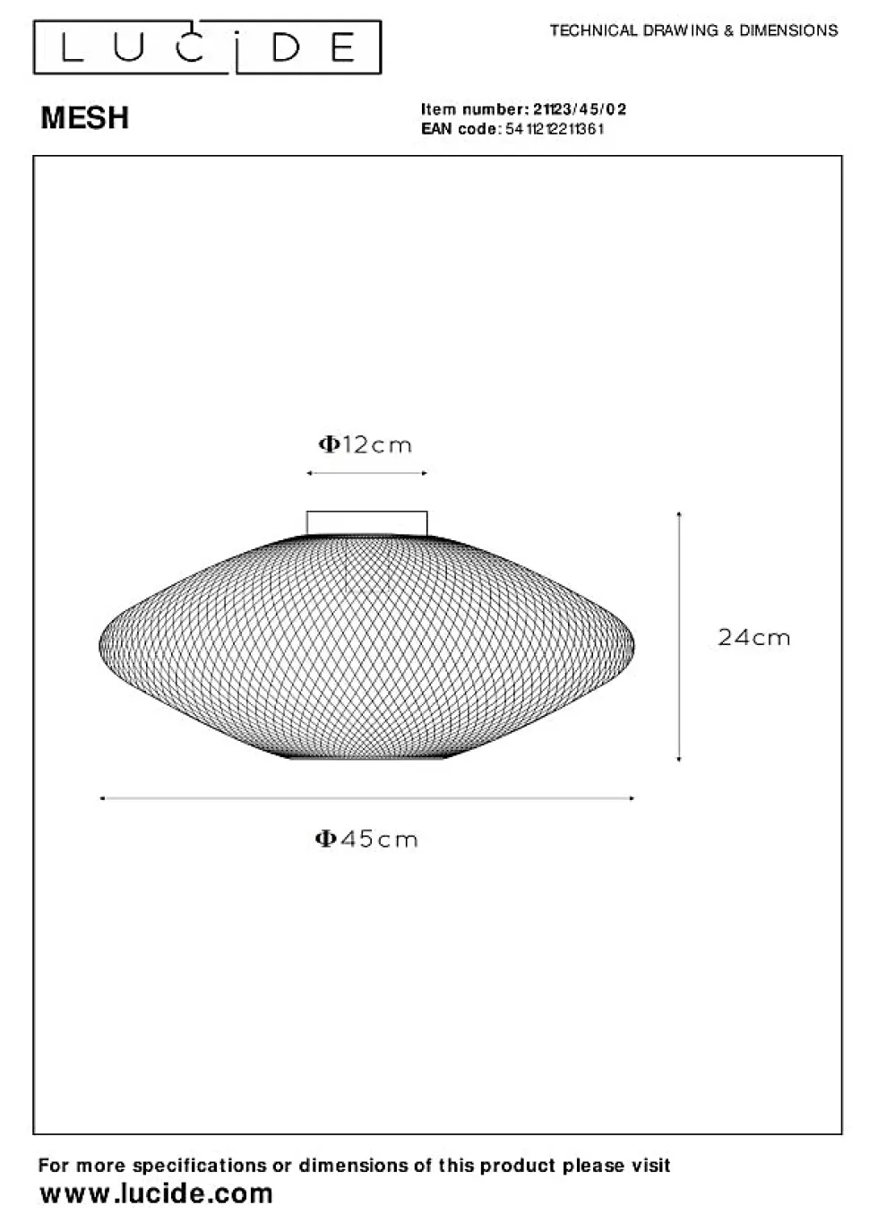 Le plafonnier Mesh élève le design élégant à un niveau supérieur avec son modèle en maille métallique. Le résultat : un luminaire à l’enveloppe extérieure claire offrant une vue complète du point lumineux situé à l’intérieur. Voici pourquoi Mesh occupe une place de premier plan si vous recherchez une lampe à incandescence. Avec son diamètre de près d’un demi-mètre et sa forme si particulière, Mesh ne passe pas inaperçue, que vous l’installiez dans le salon, la cuisine ou la chambre à coucher. Une fois reliée à un variateur d’intensité, elle crée également une atmosphère instantanée.Caractéristiques uniques:• Utilisable avec une source lumineuse LED• Facile à connecter à un variateur (non fourni)• Fabriqué en métalPrincipales caractéristiques du produit:• Consommation énergétique: 1x40W / 230V / A intensité variable (Ampoule non incluse)• Dimensions: Ø45 cm Haut.24 cm• 2 Ans garantie sur le luminaire / source de lumière appropriée est EAN: 5411212491046Pourquoi choisir l’éclairage Lucide?Lucide incarne un design innovant, un savoir-faire artisanal et une fiabilité exemplaire. En tant qu’entreprise familiale belge avec plus de trois décennies d’expertise, nous concevons des éclairages de haute qualité qui enrichissent et transforment chaque espace, tant intérieur qu’extérieur. Notre collection polyvalente comprend des luminaires durables et des sources lumineuses économes en énergie, soigneusement conçus par nos propres experts et fabriqués selon les normes CE les plus strictes. Grâce à notre large gamme, nous vous proposons toujours une solution d’éclairage adaptée, quel que soit le style ou l’espace. Ainsi, nous illuminons non seulement votre espace de vie mais aussi votre processus de choix dans la recherche d’un éclairage de qualité et abordable. Chez Lucide, nous combinons innovation et savoir-faire pour un éclairage qui ajoute non seulement de l’ambiance, mais transforme chaque mais…