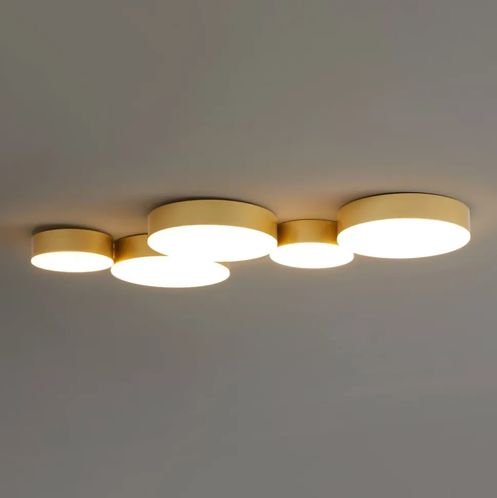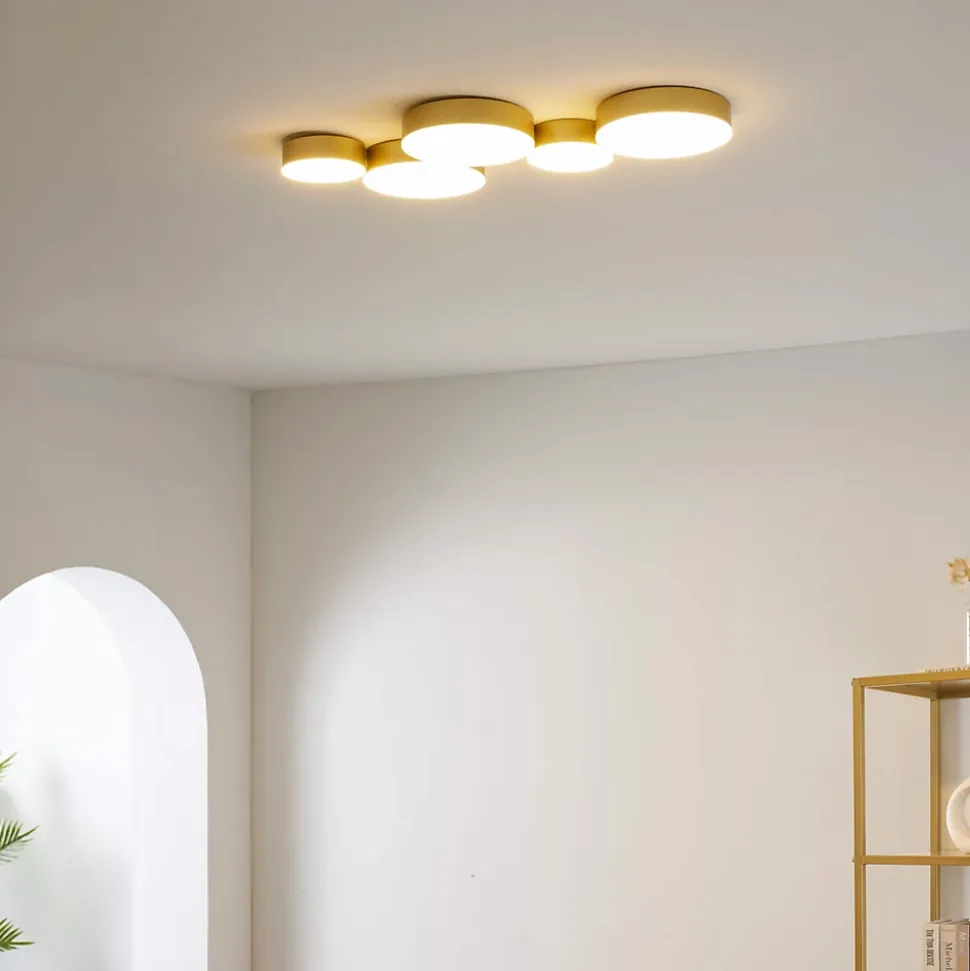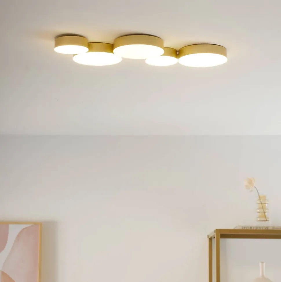 Avec sa conception polyvalente, Skavi peut être installé aussi bien au plafond qu’au mur. Doté de LED intégrées et d’un transformateur, ce luminaire présente 5 cercles lumineux recouverts d’une plaque blanche en PVC. La finition dorée et le rendu lumineux blanc chaud (3000K) ajoutent une ambiance chaleureuse à votre intérieur. Découvrez également les autres variantes de la collection Skavi, notamment en noir et en doré à 4 cercles, pour une coordination parfaite.) Livré monté, prêt à installer (
