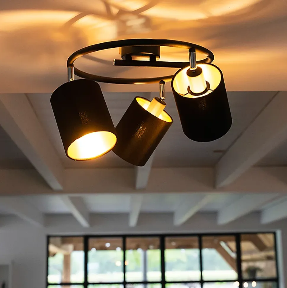 La combinaison d’une finition noire et d’un abat-jour intérieur doré confère à notre plafonnier Lofty un look élégant. Il a un diamètre total de 60 cm et une hauteur de 24,5 cm. La plaque de montage pour le plafond a un diamètre de 8 cm. Voici une fonctionnalité intéressante : le plafonnier peut être incliné, ce qui vous permet de diriger la lumière où vous le souhaitez. Vraiment pratique dans le salon ou le couloir ! Vous complétez le plafonnier en ajoutant trois ampoules attrayantes qui s’adaptent à un culot E14 (chacune max 25W). La lumière peut également être atténuée à l’aide d’un variateur externe. Créez une ambiance cosy avec le Lofty !
