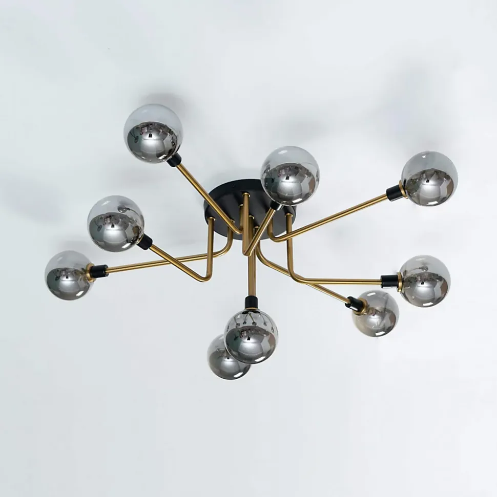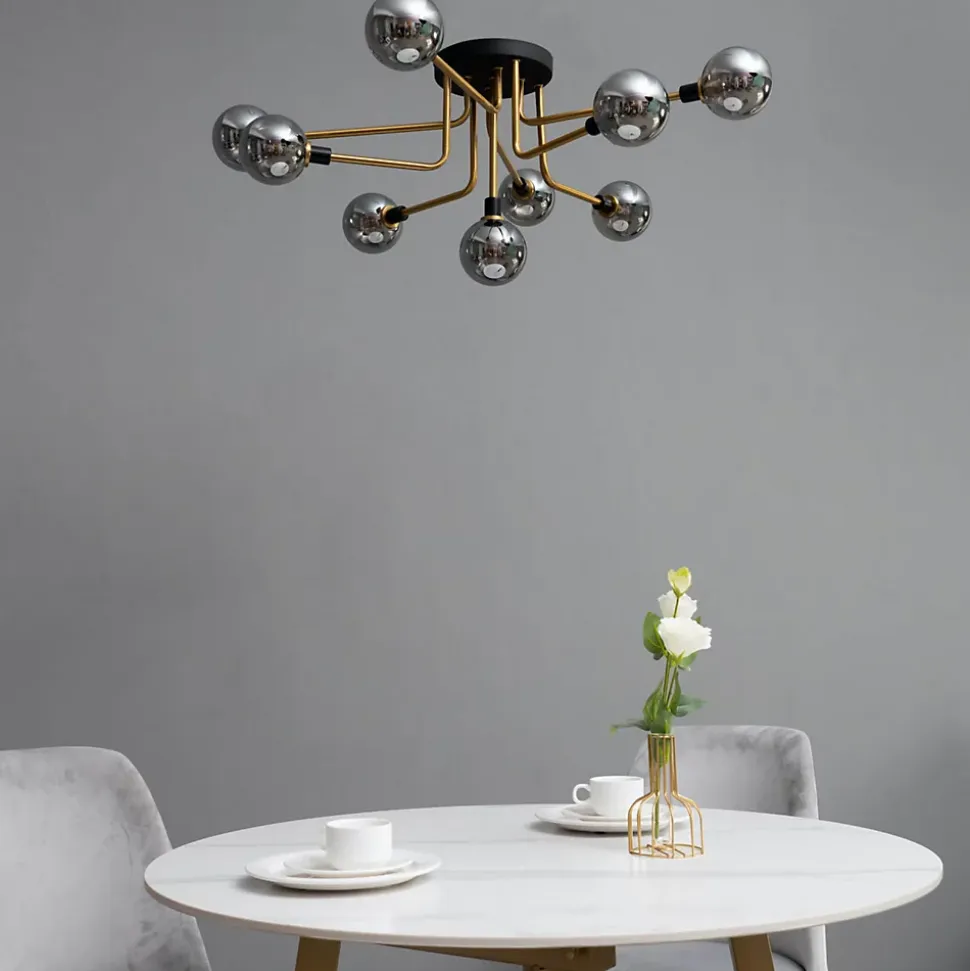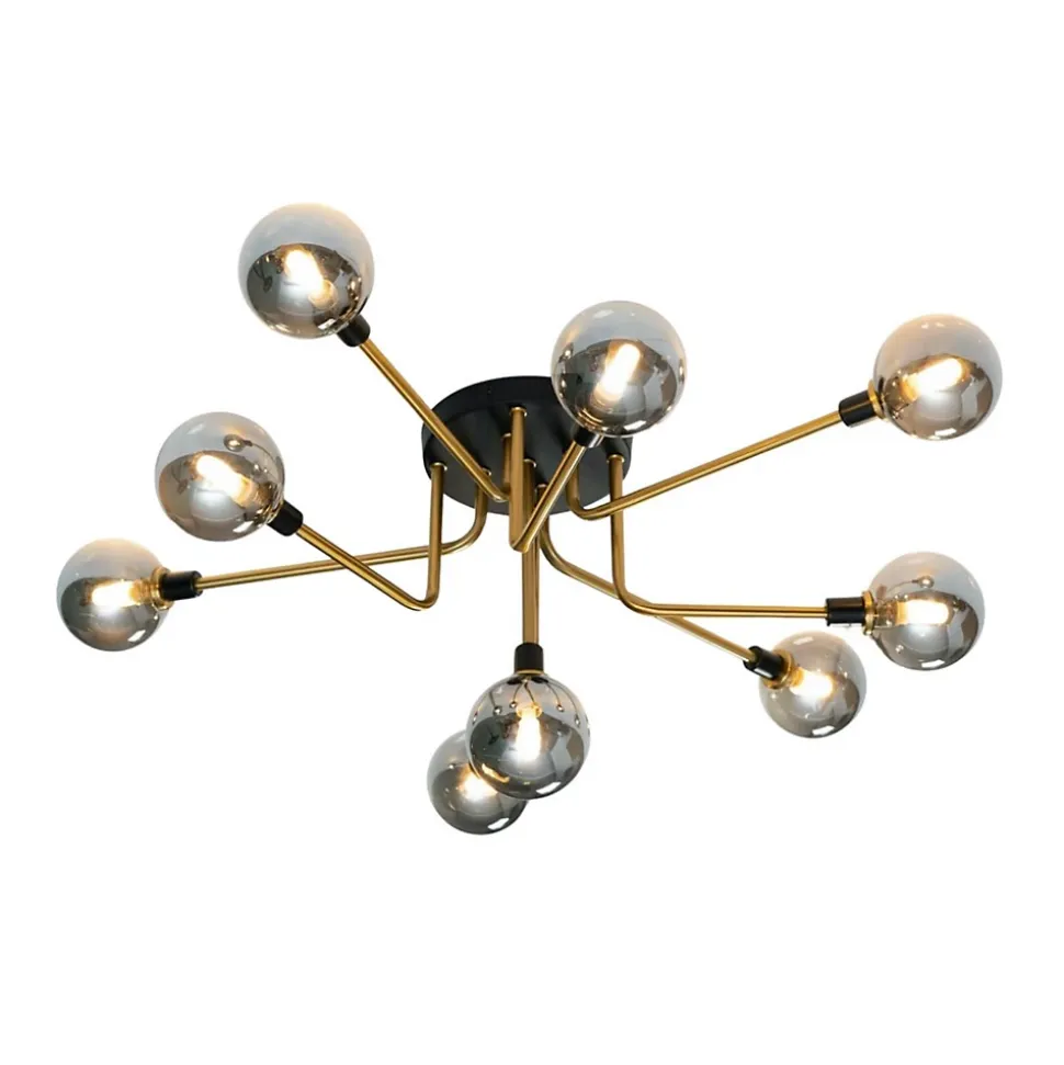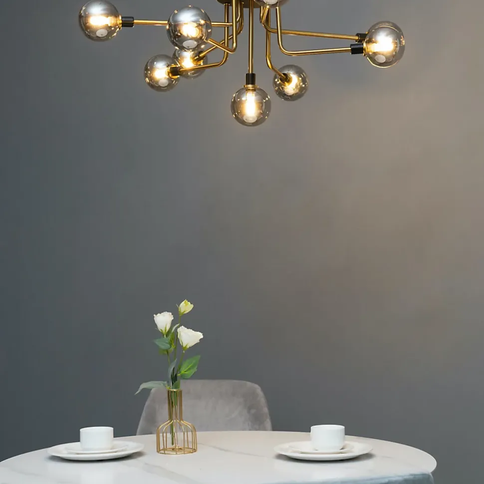 Laissez vous charmer par Merano et ses 9 boules en verre fumé. Ce grand plafonnier de 85 cm de diamètre est parfait pour l’éclairage principal d’un grand séjour ou d’une chambre. Le socle est de couleur noire et les bras qui s’entremêlent sont en métal finition laiton. La structure robuste est adoucie par la finesse des sphères en verre. Chaque sphère abrite une ampoule G9. Aussi beau à regarder éteint qu’une fois allumé, ce luminaire très décoratif avec son design géométrique unique égayera votre intérieur !) Assemblage à faire par vos soins (