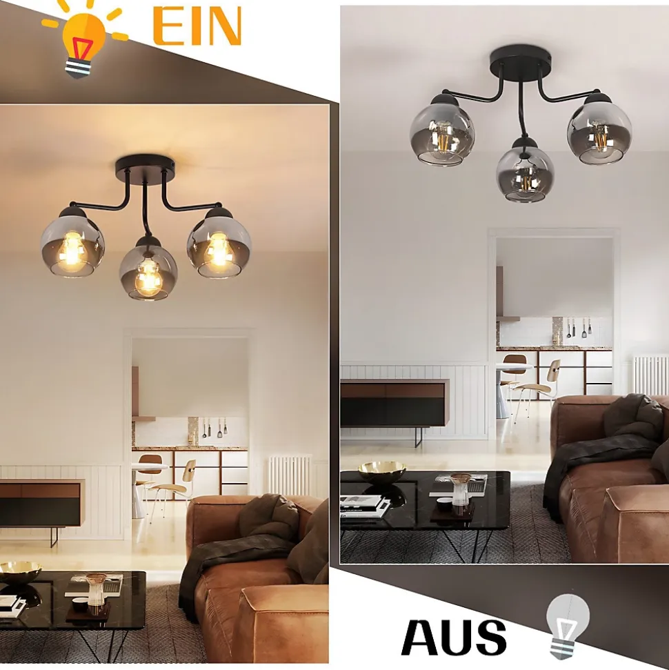Verre naturel : Ce plafonnier est d’une beauté époustouflante ! L’effet verre fumé confère à la lampe un aspect mystérieux et atmosphérique. C’est un produit naturel, durable et facile d’entretien grâce à sa composition. Grâce à son verre transparent, ce plafonnier apporte une touche chaleureuse à votre intérieur. Installation facile grâce à une tension de raccordement uniforme : Grâce à la tension de raccordement uniforme de 230 volts, l’installation du plafonnier est particulièrement pratique. Veuillez noter qu’une prise secteur n’est pas incluse et que l’installation doit donc être effectuée par un professionnel. Caractéristiques du produit : La lampe de salon a un diamètre de 35 cm et une hauteur de 25,6 cm. La plaque de montage a un diamètre de 13 cm et une hauteur de 2,5 cm. Vous pouvez équiper le plafonnier de trois sources lumineuses, chacune équipée d’une douille E27 (max. 25 W) (ampoules non fournies). Les abat-jour en verre ont chacun un diamètre de 13 cm et une hauteur de 11,5 cm ; l’ouverture de la boule de verre a un diamètre de 8,3 cm. Du classique au futuriste : ce plafonnier en métal et verre, d’un noir élégant, est absolument intemporel ! Les plafonniers en verre peuvent être très classiques ou extravagants, et sobres ou futuristes à l’extrême. Quoi qu’il en soit, les plafonniers en verre ont en commun de diffuser magnifiquement la lumière et d’être toujours élégants et contemporains. ADAPTÉ À TOUS LES INTÉRIEURS : ce plafonnier vintage en forme de boule de verre est l’éclairage idéal pour toutes les pièces. Que ce soit dans la salle à manger, le salon, la cuisine ou la chambre, il apportera une touche glamour vintage unique à votre espace. Avec son délicat abat-jour en forme de boule de verre et son design élégant, il allie à merveille modernité et vintage.
