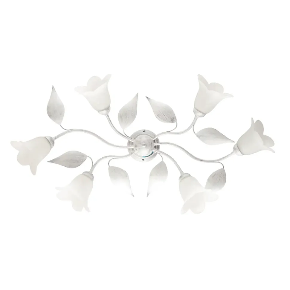 Plafonnier en fer laqué blanc décor argent vieilli et diffuseurs en verre albâtre blanc diamètre 14, 6 lumières – H.20 – L.70 Mesures du produit : H.20 – L