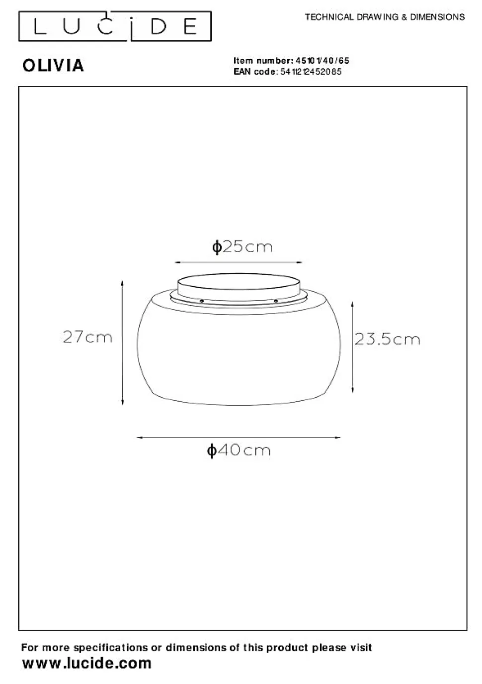 Un beau nom pour un beau plafonnier. Voici Olivia. La combinaison de verre fumé de haute qualité et de métal fait de ce plafonnier un ajout luxueux à votre maison. L’abat-jour rond élève chaque intérieur moderne à un niveau supérieur. Le plafonnier a un diamètre de 40 centimètres et une hauteur de 27 centimètres. Les 3 sources lumineuses LED baigneront votre salon, chambre à coucher, cuisine ou bureau dans la bonne lumière. Connectez-la à un gradateur et Olivia créera l’atmosphère idéale en soirée également.Caractéristiques uniques:• Utilisable avec des sources lumineuses LED• Facile à connecter à un variateur (non fourni)• Fabriqué en verrePrincipales caractéristiques du produit:• Consommation énergétique: 3x40W / 230V / A intensité variable (Ampoules non incluses)• Dimensions: Ø40 cm Haut.27 cm• 2 Ans garantie sur le luminaire / source de lumière appropriée est EAN: 5411212491046Pourquoi choisir l’éclairage Lucide?Lucide incarne un design innovant, un savoir-faire artisanal et une fiabilité exemplaire. En tant qu’entreprise familiale belge avec plus de trois décennies d’expertise, nous concevons des éclairages de haute qualité qui enrichissent et transforment chaque espace, tant intérieur qu’extérieur. Notre collection polyvalente comprend des luminaires durables et des sources lumineuses économes en énergie, soigneusement conçus par nos propres experts et fabriqués selon les normes CE les plus strictes. Grâce à notre large gamme, nous vous proposons toujours une solution d’éclairage adaptée, quel que soit le style ou l’espace. Ainsi, nous illuminons non seulement votre espace de vie mais aussi votre processus de choix dans la recherche d’un éclairage de qualité et abordable. Chez Lucide, nous combinons innovation et savoir-faire pour un éclairage qui ajoute non seulement de l’ambiance, mais transforme chaque maison en foyer.
