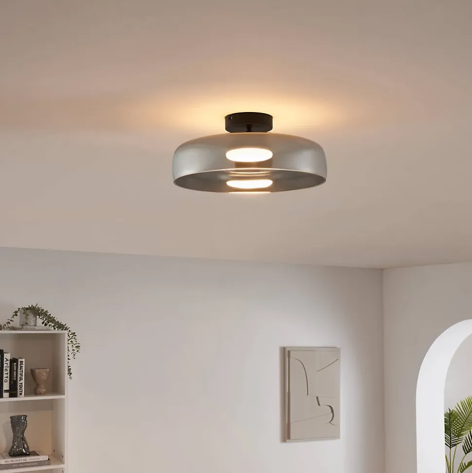 Riccardo est un plafonnier qui allie modernité et élégance, doté d’un design en verre fumé et métal noir. Mesurant 42 cm de diamètre, il offre une lumière douce grâce à sa LED intégrée de 15W, créant une ambiance chaleureuse. Ce luminaire est parfait pour apporter une touche raffinée à votre intérieur et convient parfaitement pour éclairer un salon ou une chambre avec style. Explorez la collection Riccardo ici.) Assemblage simple requis (