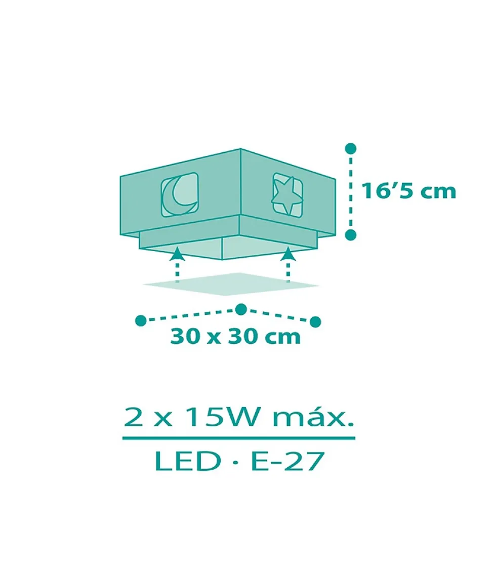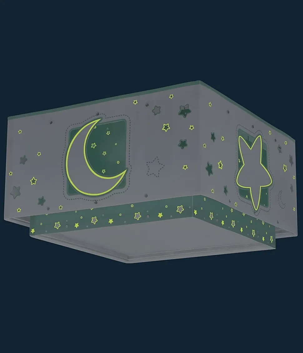 Plafonnier avec 2 lumières lune et étoile vert, composé d’un double abat-jour avec des motifs découpés et brille dans le noir.