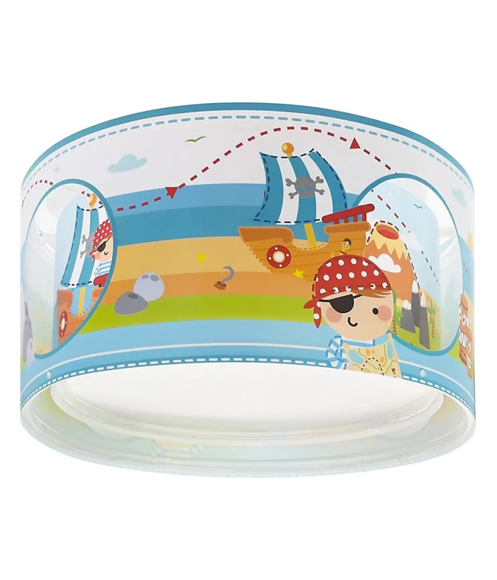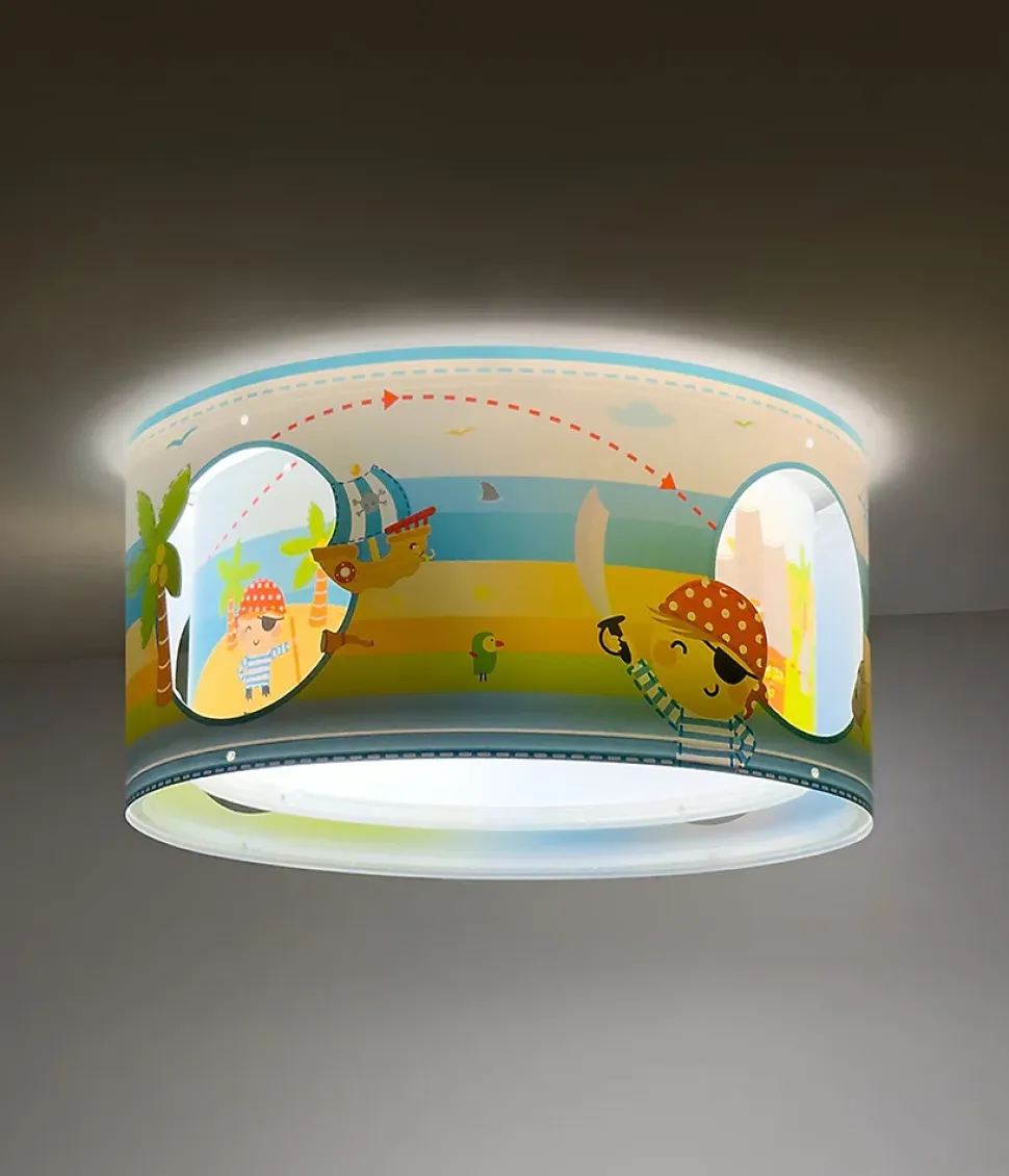 Plafonnier enfant 2 lumières Pirate Island. Île en vue ! L’aventure commence avec ce sympathique pirate en quête de trésor. Réalisé avec un double écran et avec des figures découpées pour un effet bidimensionnel.