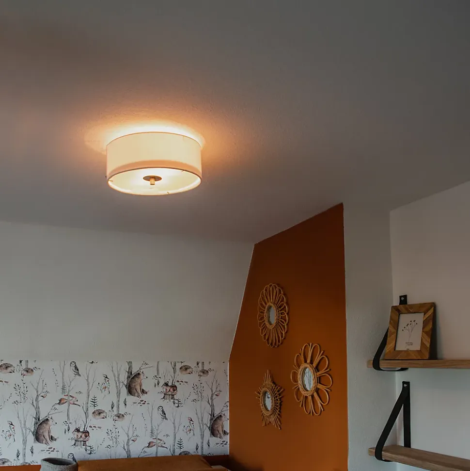 Un plafonnier rond intemporel avec un abat-jour dans une belle couleur blanc/crème. Le tissu utilisé pour l’abat-jour est en jute. Le plafonnier Drum Jute est magnifiquement fini avec une plaque en verre mat sur le dessous, ce qui crée un effet d’éclairage apaisant dans la maison. La lampe a un diamètre de 30 cm et une hauteur de 13 cm. La lampe est dimmable avec un variateur externe (variateur non inclus). Vous pouvez compléter votre Drum Jute avec deux ampoules qui s’adaptent à un culot E27 (chacune max. 40W). Un plafonnier agréable pour n’importe quelle pièce de la maison !