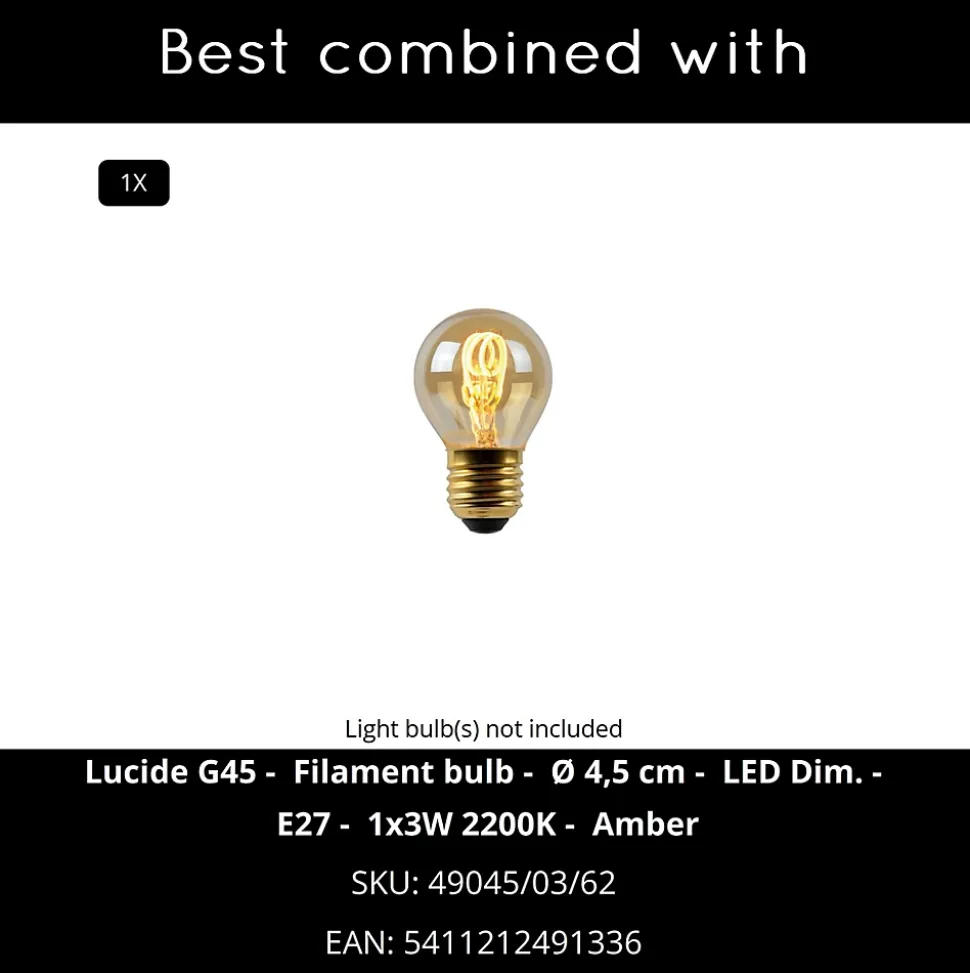 Une sphère illuminant le ciel – ou plutôt le plafond. Le plafonnier Tricia est une étoile brillante dans le firmament de l’éclairage. La sphère de verre renfermant la source lumineuse est fixée à un élégant disque métallique. Tels les anneaux de Saturne, ce disque reflète la lumière diffuse de Tricia. La combinaison d’un métal de haute qualité, d’un verre véritable et d’une finition mate confère à ce plafonnier un aspect moderne. De plus, vous pouvez facilement connecter la lampe à un variateur. Vous êtes ainsi maître de l’atmosphère à tout moment et dans n’importe quelle pièce.Caractéristiques uniques:• Utilisable avec une source lumineuse LED• Facile à connecter à un variateur (non fourni)• Fabriqué en métalPrincipales caractéristiques du produit:• Consommation énergétique: 1x15W / 230V / A intensité variable (Ampoule non incluse)• Dimensions: Ø25 cm Haut.17,5 cm• 2 Ans garantie sur le luminaire / source de lumière appropriée est EAN: 5411212491336Pourquoi choisir l’éclairage Lucide?Lucide incarne un design innovant, un savoir-faire artisanal et une fiabilité exemplaire. En tant qu’entreprise familiale belge avec plus de trois décennies d’expertise, nous concevons des éclairages de haute qualité qui enrichissent et transforment chaque espace, tant intérieur qu’extérieur. Notre collection polyvalente comprend des luminaires durables et des sources lumineuses économes en énergie, soigneusement conçus par nos propres experts et fabriqués selon les normes CE les plus strictes. Grâce à notre large gamme, nous vous proposons toujours une solution d’éclairage adaptée, quel que soit le style ou l’espace. Ainsi, nous illuminons non seulement votre espace de vie mais aussi votre processus de choix dans la recherche d’un éclairage de qualité et abordable. Chez Lucide, nous combinons innovation et savoir-faire pour un éclairage qui ajoute non seulement de l’ambiance, mais transforme chaque maison…
