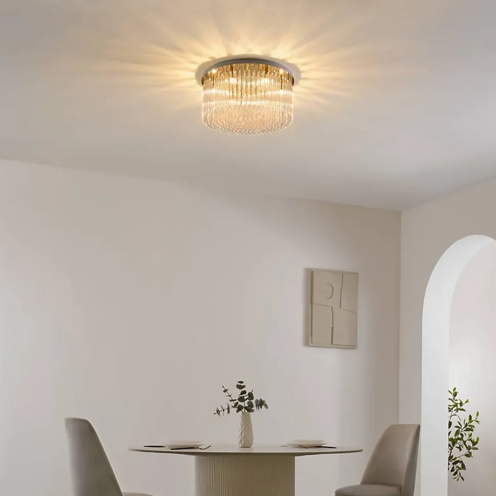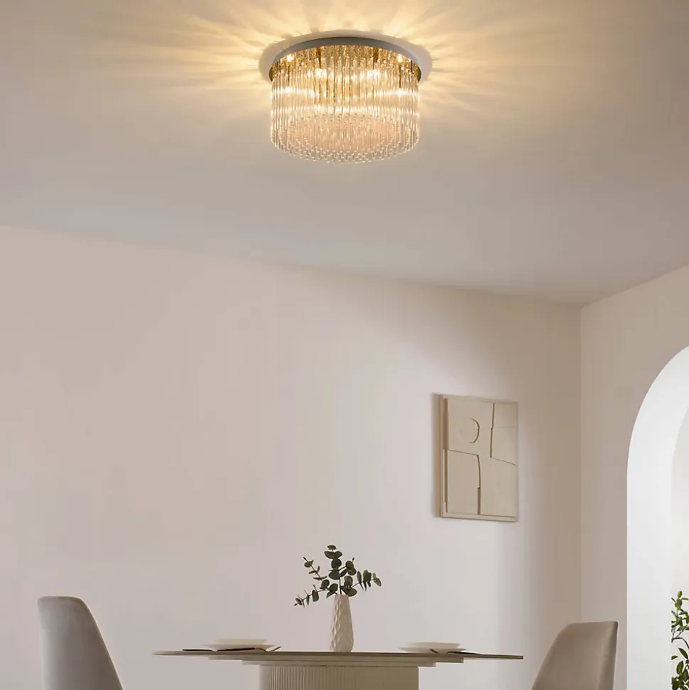 Le plafonnier Sandrilla est un modèle très chic qui fonctionne avec 6 ampoules G9 (non fournies). Mesurant 42 cm, il est compatible avec un variateur de luminosité. Son grand socle à la finition dorée brillante est orné de lames en verre transparent. Lorsqu’il est allumé, la lumière se réfléchit à travers les verres, produisant de superbes effets lumineux et un jeu de lumière captivant. Idéal pour votre salon ou votre salle à manger, ce luminaire apportera une touche d’élégance à votre espace. Retrouvez la collection Sandrilla ici.) Assemblage à faire par vos soins (