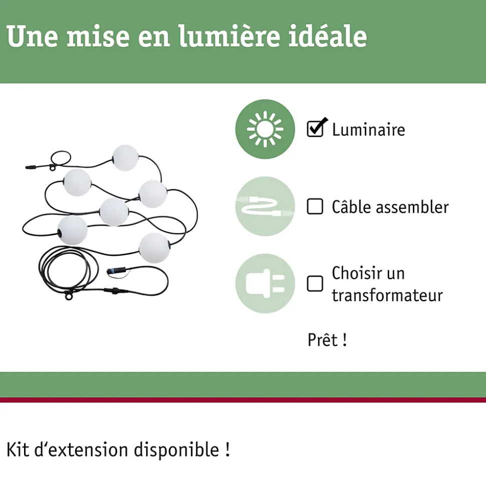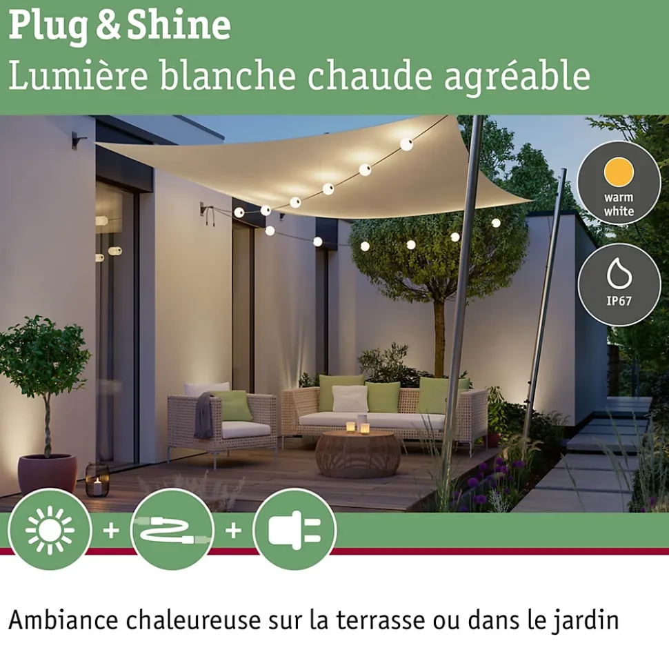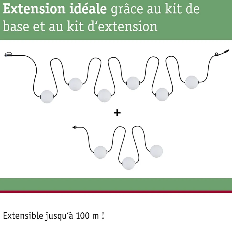 Guirlande décorative avec ampoules interchangeables|Kit de base comprenant 6 balles|Longueur totale de 5,8 m|Indice IP : IP 67 – Protection contre les immersions temporaires|À combiner avec tous les accessoires de la série Plug & Shine|Température de couleur : 3000K – blanc chaud|Ne pas oublier: commander simultanément le transformateur adapté!|Commutable et gradable par télécommande avec le régulateur Plug & Shine (voir accessoires)