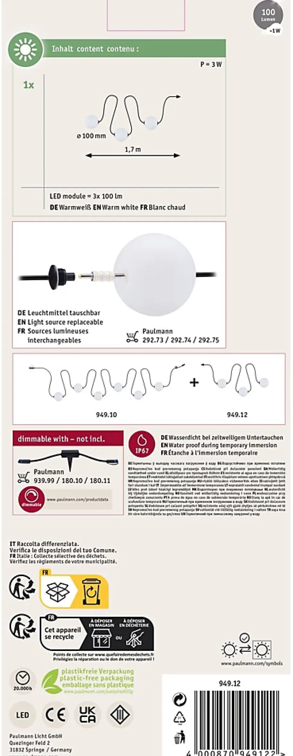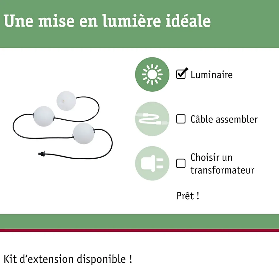 Guirlande décorative avec ampoules interchangeables|Kit d’extension comprenant 3 boules|Longueur totale de 1,7 m|Indice IP : IP 67 – Protection contre les immersions temporaires|À combiner avec tous les accessoires de la série Plug & Shine|Température de couleur : 3000K – blanc chaud|Ne pas oublier: commander simultanément le transformateur adapté!|Commutable et gradable par télécommande avec le régulateur Plug & Shine (voir accessoires)