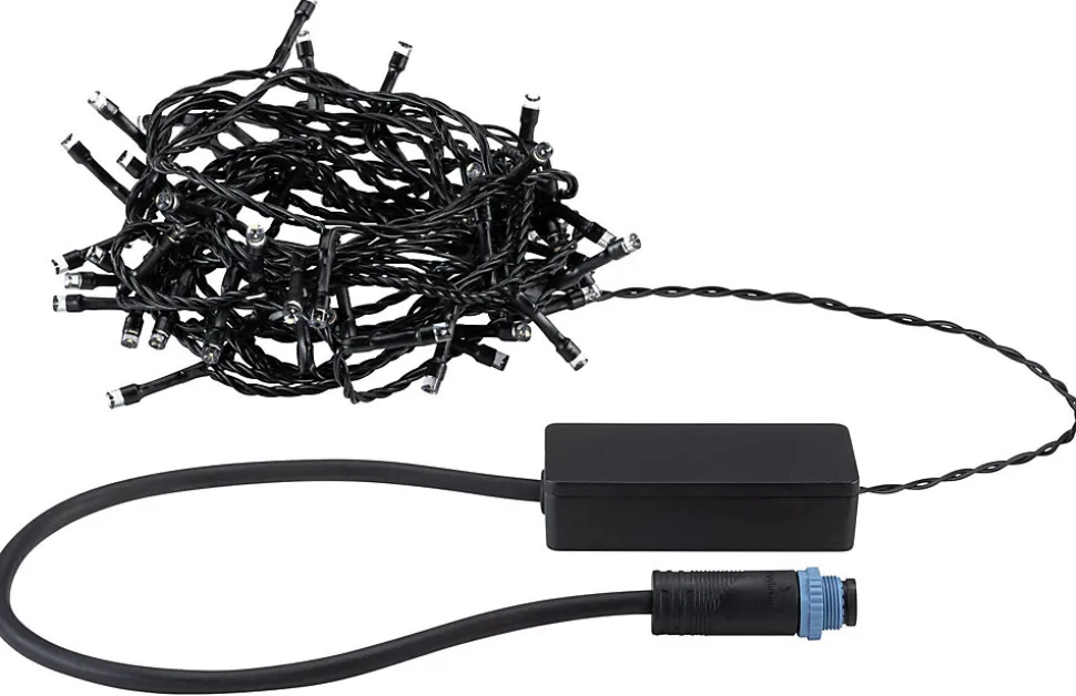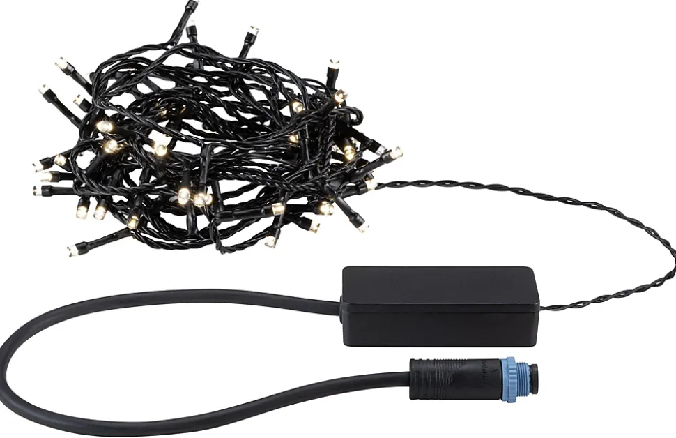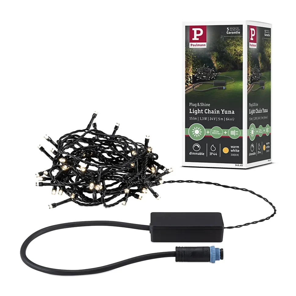 Longueur totale de 5 m|IP44 : Protection contre les projections d’eau en extérieur|Guirlandes lumineuses pour un éclairage ornemental additionnel dans le jardin, l’espace assis ou sur la terrasse|À combiner avec tous les accessoires de la série Plug & Shine|Température de couleur : 3000K – blanc chaud|Ne pas oublier: commander simultanément le transformateur adapté!|Commutable et gradable par télécommande avec le régulateur Plug & Shine (voir accessoires)
