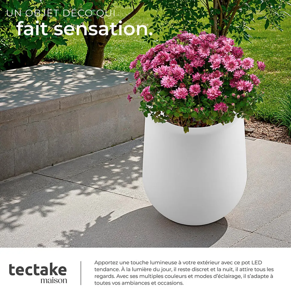 Un atout lumineuxDécouvrez le pot de fleurs LED Luminous Curve Pot de tectake et laissez vos plantes devenir un point central et éclatant de votre espace intérieur ou extérieur. Avec son design élégant, il crée une ambiance de bien-être absolue et attire tous les regards en toute simplicité.Une décoration personnalisableChoisissez facilement parmi 16 couleurs RGB différentes et 5 modes lumineux à l’aide de la télécommande et créez une atmosphère qui s’adapte à chacune de vos humeurs – qu’il s’agisse d’un blanc discret ou d’un rouge intense, de couleurs statiques ou de plusieurs couleurs s’enchaînant les unes après les autres tel un stroboscope ou un mode calme.Fabrication solideCette élégante lumière extérieure est fabriquée en polyéthylène robuste, garantissant non seulement une durabilité maximale, mais aussi une résistance parfaite aux intempéries. Le matériau résiste à la pluie, au soleil et même au gel, permettant ainsi une utilisation extérieure toute l’année. Pour une stabilité optimale, 3 pieds solides ou alternativement le piquet de terre fournis assurent une sécurité maximale.Plongez votre extérieur dans un jeu de lumière magique avec le pot de fleurs LED Luminous Curve Pot de tectake !