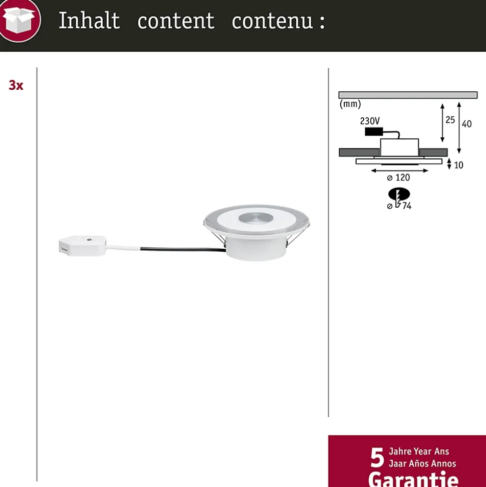 Spots LED encastrables Paulmann Whirl, lot de 3 avec LED intégrée 4,9 W par spot. Éclairage blanc chaud 3000 K, flux lumineux de 200 lm par spot (600 lm au total), angle de diffusion 110° pour une lumière étendue et sans reflet. Design rond en aluminium brossé avec verre satiné, adapté aux pièces de vie comme salon, salle à manger, chambre ou cuisine. Compatible avec variateurs universels (R, L, C) pour moduler l’intensité. Indice de protection IP23, classe II, tension 230 V. Diamètre de découpe 76 mm, profondeur d’encastrement 40 mm. Contenu du paquet : 3 spots LED encastrables et notice d’utilisation.