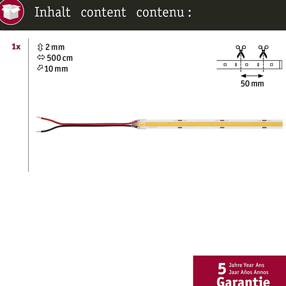 Le Pro Strip Gold P150 COB professionnel 24 V d’une longueur de 5 m et de température de couleur de 2700K, n’est pas pourvu de revêtement (IP20) et possède un câble de raccordement aux deux extrémités ouvertes. Avec 528 LED/m et 1270lm/m, le strip peut être utilisé comme éclairage de pièce sans source lumineuse supplémentaire. Les Pro Strips de qualité Gold conviennent parfaitement à une utilisation professionnelle dans des locaux commerciaux et privés, par des installateurs électriques par exemple, et produisent une très bonne qualité de lumière avec un rendu des couleurs de CRI ≥ 90 et une consistance des couleurs de SDCM 3. Des composants de haute qualité garantissent une longue durée de vie d’au moins 50 000 heures. Commandez également le Controller et la télécommande, y compris la commande d’une ou de plusieurs zones, ainsi que les fonctions Quick Connect et réseau maillé. Vous avez également le choix entre les connecteurs Slim ou Quick, qui couvrent toutes les possibilités de raccordement et visent un encombrement minimal ou une installation efficace. De plus, une sélection d’alimentations à très longue durée de vie (50 000 heures) est disponible en cinq niveaux de puissance.
