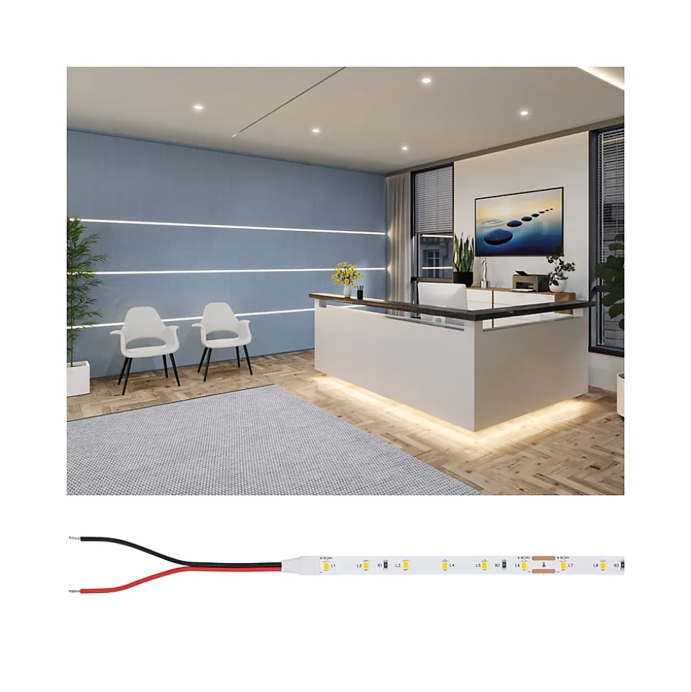 Des Strips LED de haute qualité pour des projets d’éclairage intérieur professionnels|Longue durée de vie de 50 000 h|Rendu des couleurs CRI ≥ 90 et consistance des couleurs SDCM 3|Câble d’alimentation bilatéral (200 mm)|Une logistique optimisée et durable : Emballage petit, compact et sans plastique|Ensemble d’accessoires complet : Connecteurs, commandes et accessoires d’alimentation correspondants disponibles|Sécurité de planification grâce aux données DIALux disponibles