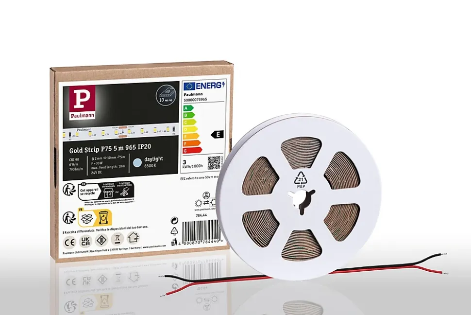 Le Pro Strip Gold P75 professionnel 24 V d’une longueur de 5 m et de température de couleur de 6500K, n’est pas pourvu de revêtement (IP20) et possède un câble de raccordement aux deux extrémités ouvertes. Avec 96 LED/m et 790lm/m, il crée un éclairage d’appoint puissant. Les Pro Strips de qualité Gold conviennent parfaitement à une utilisation professionnelle dans des locaux commerciaux et privés et produisent une excellente qualité de lumière avec un rendu des couleurs de CRI ≥ 90 et une consistance des couleurs de SDCM 3. Des composants de haute qualité garantissent une longue durée de vie d’au moins 50 000 heures. L’utilisation de LED haute puissance permet d’atteindre un rendement exceptionnellement élevé de 132, ce qui représente une économie d’énergie et des frais courants considérables. Commandez également le Controller et la télécommande, y compris la commande d’une ou de plusieurs zones, ainsi que les fonctions Quick Connect et réseau maillé. Vous avez également le choix entre les connecteurs Slim ou Quick, qui couvrent toutes les possibilités de raccordement et visent un encombrement minimal ou une installation efficace. De plus, une sélection d’alimentations à très longue durée de vie (50 000 heures) est disponible en cinq niveaux de puissance.