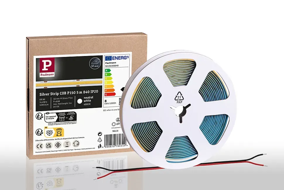 Le Pro Strip Gold P150 COB professionnel 24 V d’une longueur de 5 m et de température de couleur de 4000K, n’est pas pourvu de revêtement (IP20) et possède un câble de raccordement aux deux extrémités ouvertes. Avec 528 LED/m et 1400lm/m, le strip peut être utilisé comme éclairage de pièce sans source lumineuse supplémentaire. Les Pro Strips de qualité Silver conviennent parfaitement à une utilisation professionnelle dans des locaux commerciaux et privés et produisent une très bonne qualité de lumière avec un rendu des couleurs de CRI ≥ 80 et une consistance des couleurs de SDCM 5. Des composants de haute qualité garantissent une longue durée de vie d’au moins 30.000 heures. Commandez également le Controller et la télécommande, y compris la commande d’une ou de plusieurs zones, ainsi que les fonctions Quick Connect et réseau maillé. Vous avez également le choix entre les connecteurs Slim ou Quick, qui couvrent toutes les possibilités de raccordement et visent un encombrement minimal ou une installation efficace. De plus, une sélection d’alimentations à très longue durée de vie (50 000 heures) est disponible en cinq niveaux de puissance.