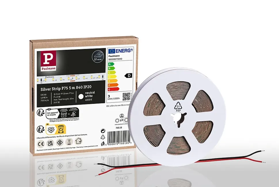 Le Pro Strip Silver P75 professionnel 24 V d’une longueur de 5 m et de température de couleur de 4000K, n’est pas pourvu de revêtement (IP20) et possède un câble de raccordement aux deux extrémités ouvertes. Avec 96 LED/m et 750lm/m, il crée un éclairage d’appoint puissant. Les Pro Strips de qualité Silver conviennent parfaitement à une utilisation professionnelle dans des locaux commerciaux et privés et produisent une très bonne qualité de lumière avec un rendu des couleurs de CRI ≥ 80 et une consistance des couleurs de SDCM 5. Des composants de haute qualité garantissent une longue durée de vie d’au moins 30.000 heures. L’utilisation de LED haute puissance permet d’atteindre un rendement exceptionnellement élevé de 156, ce qui représente une économie d’énergie et des frais courants considérables. Commandez également le Controller et la télécommande, y compris la commande d’une ou de plusieurs zones, ainsi que les fonctions Quick Connect et réseau maillé. Vous avez également le choix entre les connecteurs Slim ou Quick, qui couvrent toutes les possibilités de raccordement et visent un encombrement minimal ou une installation efficace. De plus, une sélection d’alimentations à très longue durée de vie (50 000 heures) est disponible en cinq niveaux de puissance.