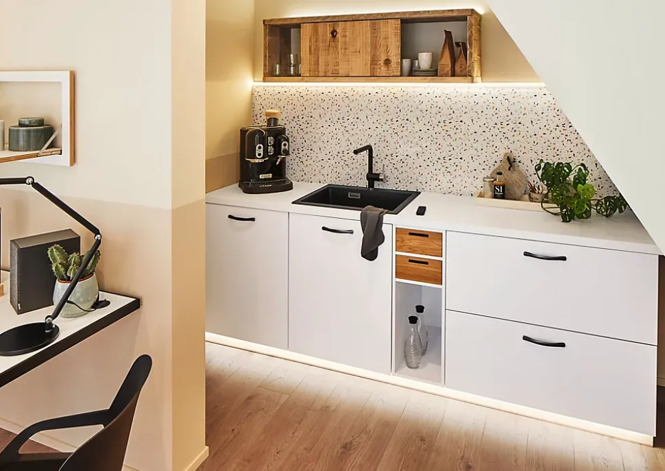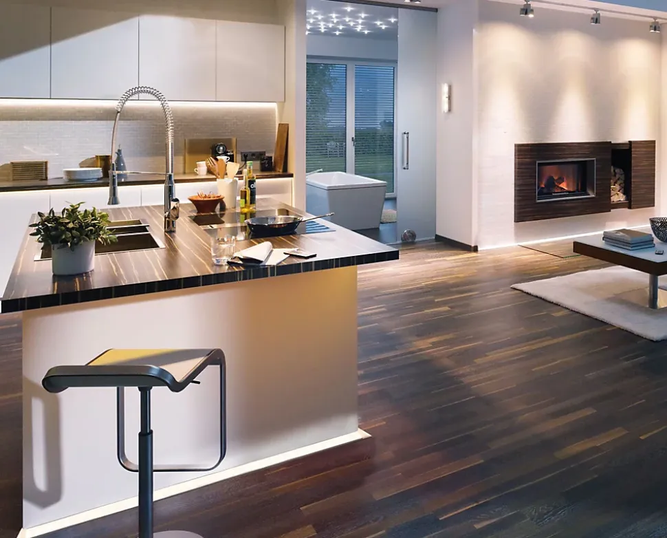 Delta Profil peut être équipé de rubans YourLED dans la température de couleur de votre choix et permet de mettre en valeur plinthes et cornières. Également utilisable comme éclairage supplémentaire de surfaces utiles ou d’éléments bas ou, pour les zones à l’ombre ou dangereuses, comme éclairage d’orientation et de guidage. Éclairage permanent par les composants LED.