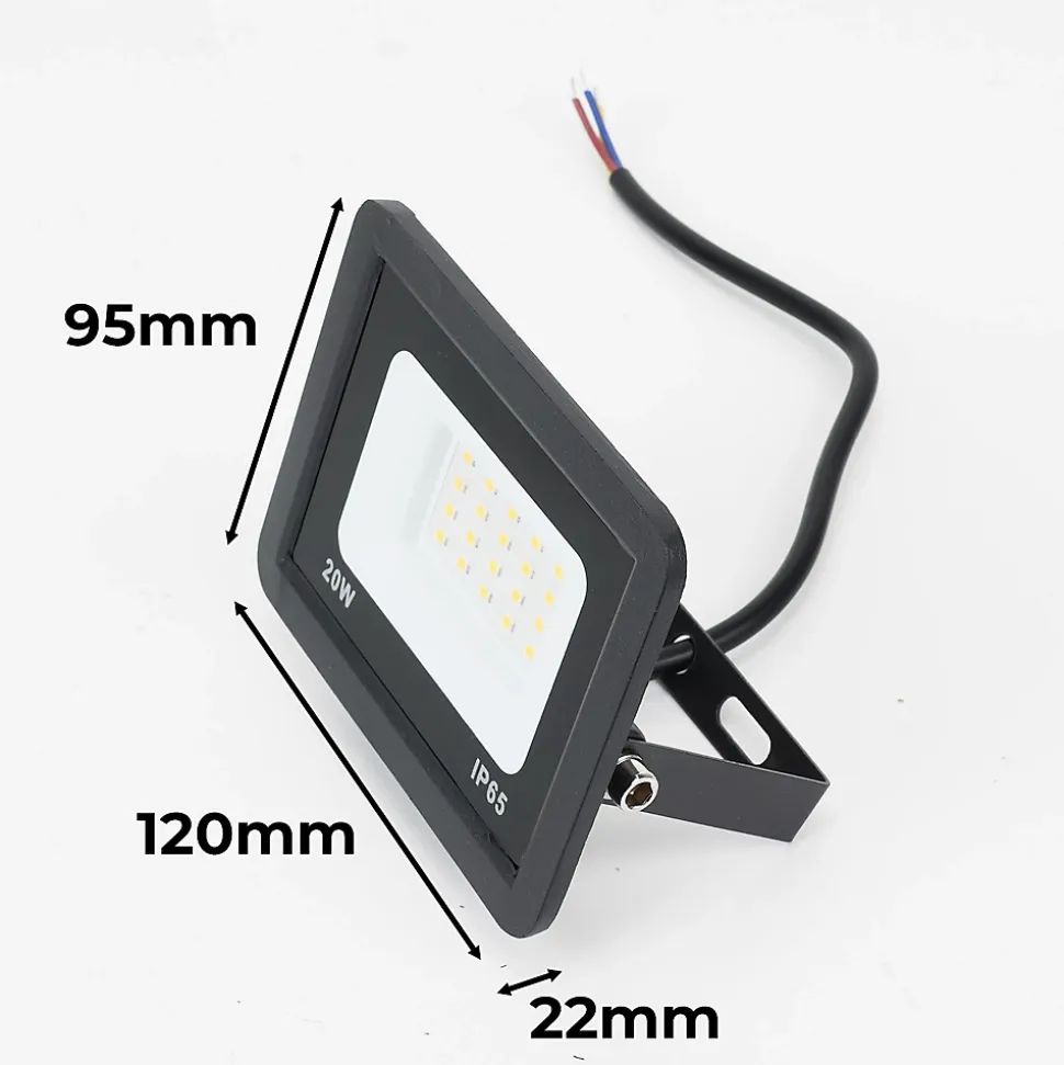 Caractéristiques du projecteur LED extérieur de 20W :Puissance efficace : 20W, idéal pour éclairer les jardins, garages, patios et autres espaces extérieurs.Protection IP65 : Résistant à l’eau et à la poussière, parfait pour supporter des conditions climatiques difficiles.Design compact et résistant : Dimensions de 95x120x22mm, boîtier métallique avec finition noire et verre trempé, garantissant durabilité et résistance.Éclairage uniforme : Angle d’ouverture de 120°, offrant une lumière sans ombres ni reflets gênants.Puces LED haute performance : Technologie SMD 2835 avec un CRI supérieur à 80, offrant une lumière naturelle et claire.Résumé des spécifications :Tension : 220-240V/ACPuissance : 20WTempérature de couleur : 3000K (chaud) ou 6000K (froid)Lumens : 1900lm (chaud) / 2100lm (froid)Angle d’ouverture : 120°Protection : IP65Ce projecteur LED de 20W allie efficacité énergétique, résistance et facilité d’installation, étant une excellente option pour éclairer n’importe quel espace avec une faible consommation d’énergie.