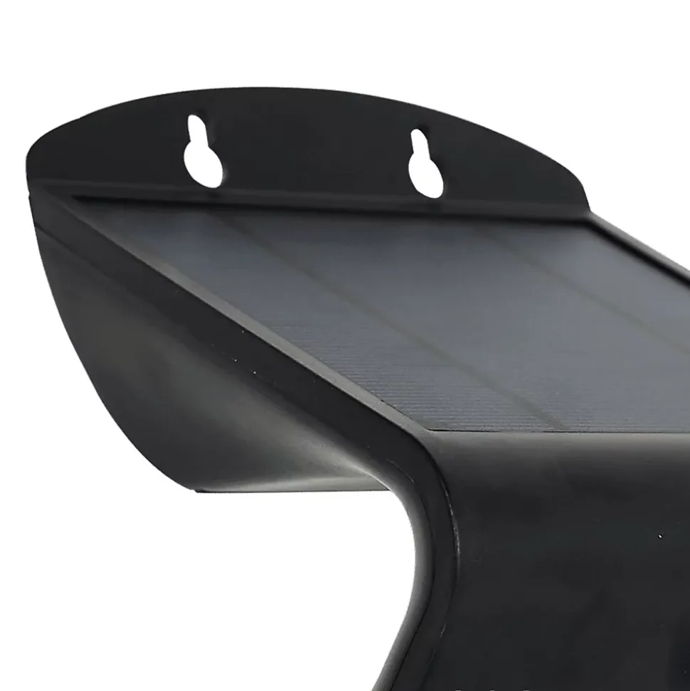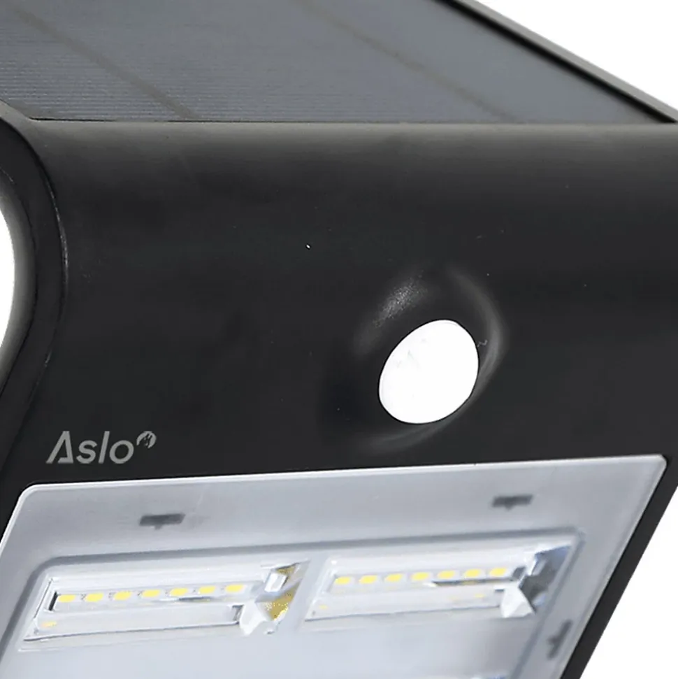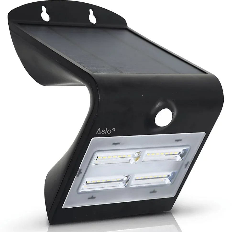 Le projecteur solaire à détecteur de mouvement ASLO offre un éclairage extérieur économique et intelligent. Il est conçu pour s’adapter à toutes les conditions météorologiques.Avec des modes d’éclairage intelligents et une batterie remplaçable, ce lampadaire solaire répond aux différents besoins d’éclairage extérieur : sécurité / décoratif. Choisissez l’efficacité énergétique et l’éclairage automatisé avec ce projecteur à panneau solaire polyvalent.Le spot solaire ASLO vous offre trois modes d’éclairage pour répondre à divers besoins :- Mode A (1 clic) : L’éclairage s’active automatiquement à la tombée de la nuit à 20 % d’intensité et s’éteint après 5 heures.- Mode B (2 clics) : L’éclairage s’active automatiquement à 100 % d’intensité (400 lm) lors de la détection d’un mouvement dans un rayon de – Mode C (3 clics) : L’éclairage s’active automatiquement à 100 % (400 lm) lors de la détection d’un mouvement dans un rayon de – 4 clics pour éteindreCaractéristiques : – Nombre de LED : Avant 28 / Arrière 2. – Puissance lampe : 3.2W. – Puissance panneau solaire : 2.3W.- Température de couleur : Avant : 6000K (blanc froid) / arrière : 3000K (blanc chaud).- Flux lumineux : 400 Lm. – Matière : Corps : ABS / Diffuseur : polycarbonate / Panneau solaire : Silicium monocristallin. – Batterie lithium 2 Ah – 3.7 V. – Détecteur de mouvements. – Angle de détection : 120°.- Distance de détection : 2-6m. – Hauteur détection : 4m.- Utilisation : extérieur. – Fixation saillie, sur mur. – Anti-UV. – Résistant au feu. – Indice de protection : IP65. – Classe d’isolation : III. – Normes CE/RoHS.- Dimensions : 14 x 10.9 x 21.2 cm. – Poids : 0.69 kg.<