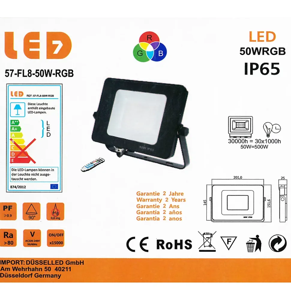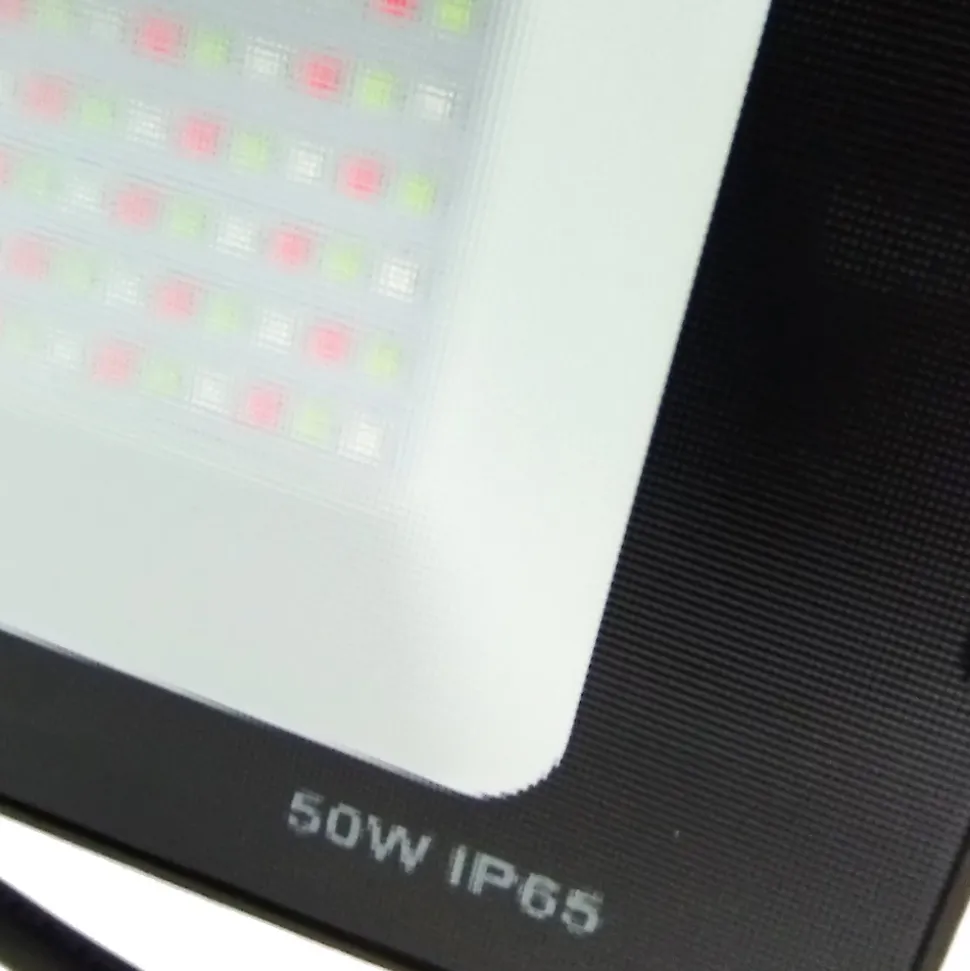 Projecteur LED pour extérieur : il s’agit d’un projecteur d’extérieur RGB à intensité variable de 50 W avec télécommande incluse. Il fournit un éclairage uniforme et lumineux sur une large zone. Il est très facile à utiliser et à intensité variable. Il dispose de 12 couleurs les plus courantes, IRC > 80, fonction mémoire et 4 modes dynamiques et peut ajuster la vitesse de changement de couleur en fonction de vos besoins dans différents scénarios.Télécommande : Utilisez une télécommande qui change le projecteur LED extérieur 12 couleurs les plus courantes, 4 modes (flash/strobe/fade/lisse) qui ajustent la fréquence de changement de couleur. Vous pouvez utiliser le mode personnalisé pour définir n’importe quelle couleur que vous souhaitez clignoter, et vous pouvez régler la vitesse en fonction des scènes. Il peut répondre à vos différents besoins.3 couleurs principales : rouge, vert, bleu (total 12 couleurs différentes).Télécommande Modes : FLASH / STROBE / FADE / SMOOTH.La pile de la télécommande : 1 pile bouton CR2025 (pile incluse)Dimension : 201*145*25mmPuissance nominale : 50WTension nominale : AC 220-240V 50HzAngle de diffusion : 90°Indice d’étanche : IP65IRC : >80RaGarantie : 2 ans