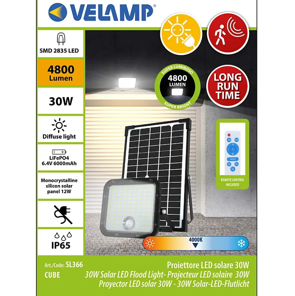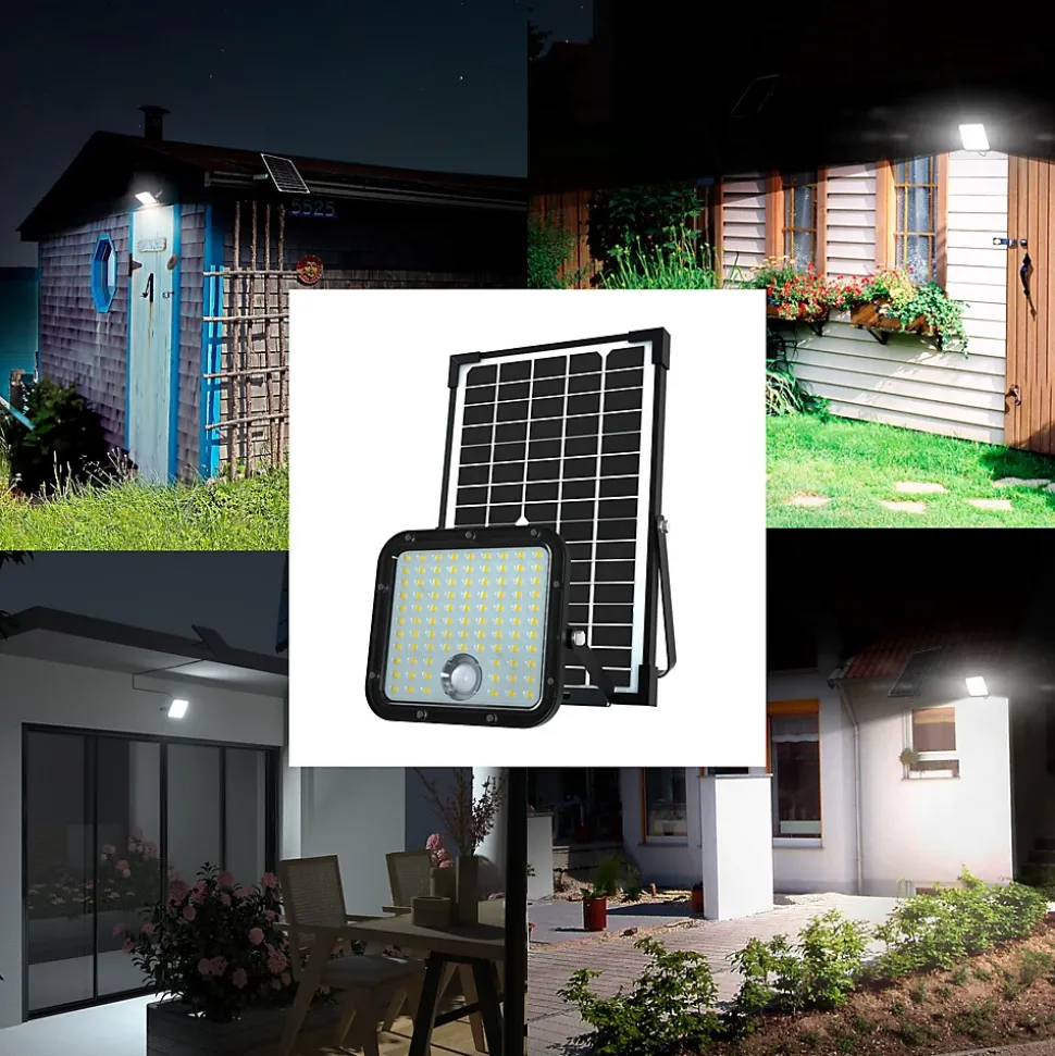 Extrêmement lumineux : grâce à l’utilisation de LED SMD de dernière génération, la lampe solaire CUBE atteint 4800 lumens. C’est un éclairage de sécurité parfait pour éclairer un passage, une entrée, un jardin 2 modes de fonctionnement : 1) Mode lumière constante : la lampe s’allume automatiquement la nuit (vous pouvez régler la durée de l’éclairage et la puissance d’éclairage) 2) Mode détecteur de mouvement : La lampe s’allume s’allume automatiquement la nuit. Elle s’allume à pleine luminosité lorsqu’un mouvement est détecté, puis réduit la luminosité après 60 secondes sans mouvements. Économie d’énergie : la lampe solaire avec détecteur de mouvement est rechargée par un panneau solaire qui capte la lumière du soleil… le tout sans facture d’électricité. Le panneau solaire et le projecteur sont séparés et reliés par un câble de 5 mètres de long : cela permet de placer le panneau là où il recevra le plus de soleil possible, et le projecteur sous le toit, au mur, à l’intérieur où vous voulez . Installation facile : il suffit de fixer le spot au mur (support réglable) et de le connecter au panneau solaire à l’aide du connecteur étanche. L’installation est terminée !Imperméable et durable : avec la certification IP65 (résistant à l’eau), cette lampe solaire est adaptée à tous les environnements météorologiques. Corps en polycarbonate extrêmement robuste. Le panneau solaire 12,5W est en plastique hyper résistant. La batterie incluse est également remplaçable (Li-ion 6,4Ah 32700) : elle donne jusqu’à 60 heures de lumière… Lumière fonctionnelle 4000K : ni trop froide ni trop chaude. Diffuseur opalisé anti-éblouissement. Équipée d’une télécommande pour programmer la lampe.
