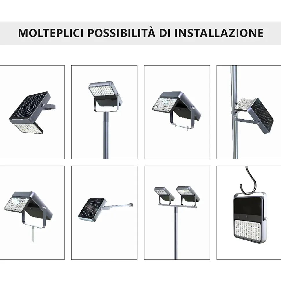 Panneau solaire polycristallin : 5V 7WBatterie interne : 3,7 V 10 000 mAh, 4x Li-Ion 18650Temps de charge de la batterie : 7 heuresAutonomie de la batterie : >12 heuresSeuil du capteur crépusculaire : activation 80lxDistance et angle de détection du capteur PIR : 5 m, 120° maxFlux lumineux maximum : 1500lmAngle de débit réglable : 60°, 90°, 120°Tonalité de couleur : 4000KPanneau LED : 8W – 60 LED SMD 2835Cycles d’allumage et durée de vie : 25 000 cycles / 50 000 heuresDegré de protection : IP65Hauteur d’installation : 2 m – 4 mPoids : 2,3 kg