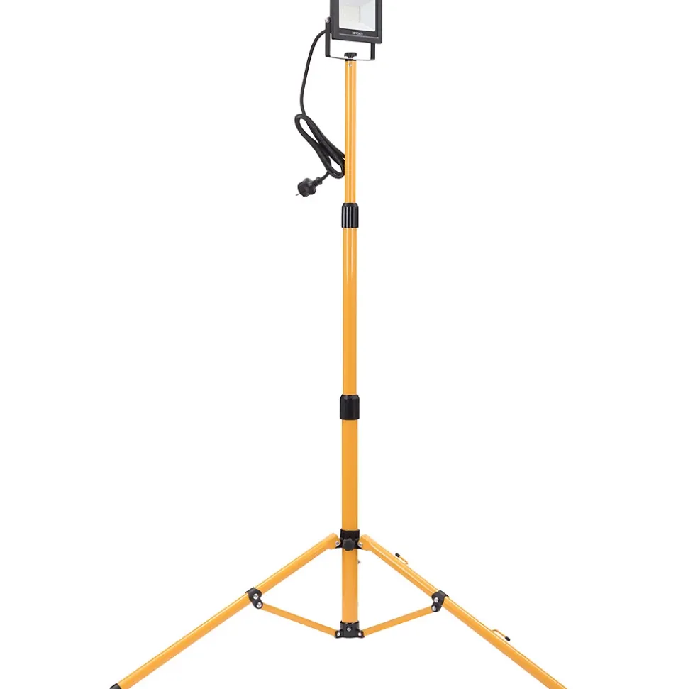 Projecteur LED trépied. Couleur(s) : jaune et noir. Puissance : 30W. Intensité lumineuse : 2100lm. Température de couleur : 6000K. Couleur d’éclairage : blanc froid. Indice de protection : IP65. Hauteur réglable jusqu’à 150cm. Câble H05RN-F 3G1mm² – 1.5m