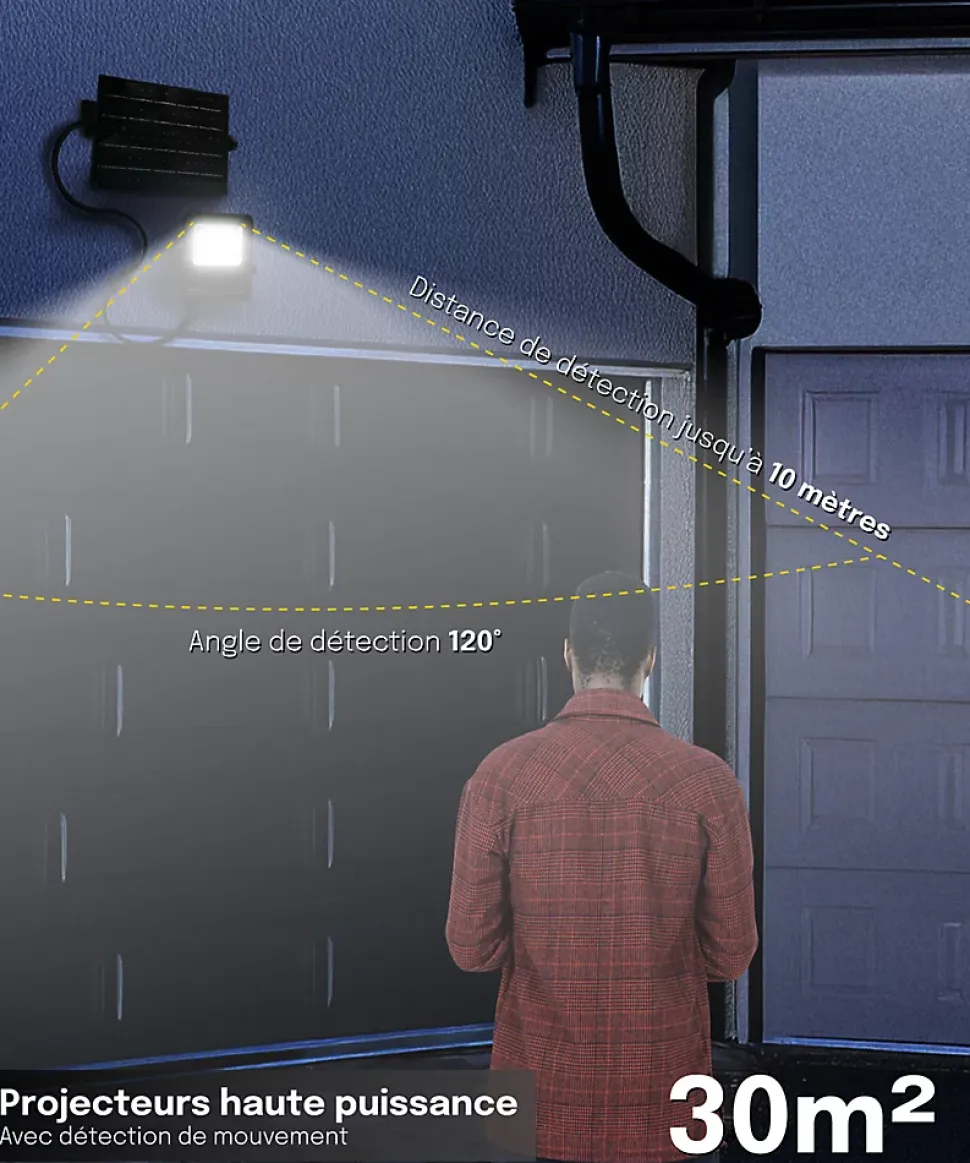 - DÉTECTION DE MOUVEMENT INTELLIGENTE 120° / 10M : Équipé d’un capteur à grand angle (120°), ce projecteur solaire avec détecteur de mouvement s’allume automatiquement dès qu’une présence est détectée jusqu’à 10 mètres. Sécurité renforcée et économies d’énergie garanties.