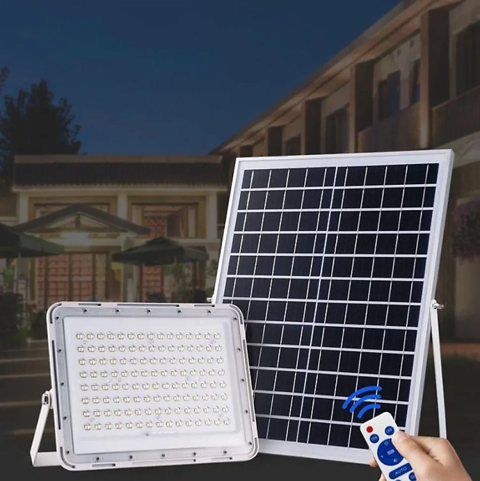 - [Projecteur Solaire LED 100W IP65 (Panneau Solaire + Télécommande Inclus)] Découvrez le Projecteur Solaire LED 100W IP65 (Panneau Solaire + Télécommande Inclus) qui permet d’éclairer vos espaces extérieurs.[Un projecteur autonome] Ce projecteur solaire est un éclairage particulièrement pratique car il n’a pas besoin d’être branché sur secteur. Sa batterie se charge en journée grâce à son panneau solaire photovoltaïque en convertissant la lumière du soleil pour créer un éclairage renouvelable. C’est donc une solution d’éclairage économique ! Sa durée de charge est d’environ 5 à 8h, cela variant selon du temps et l’exposition du panneau.[Contrôle à distance] Accompagné d’une télécommande, vous pouvez contrôler ce panneau LED solaire à distance, régler sa luminosité et l’intensité d’éclairage selon la charge encore contenue par sa batterie. Il existe également le mode « AUTO » qui permet à la lampe de s’allumer automatiquement dès la nuit tombée grâce au détecteur crépusculaire. [IP65] Son indice de protection IP65 protège le projecteur solaire des intempéries et de la poussière, ce qui le rend parfaitement adapté à une installation dans un jardin.[Installation] Pensez à installer votre projecteur sur une surface plane et stable. Placez le panneau solaire en direction du sud dans une zone lumineuse où un maximum de rayons de soleil peuvent être captés. Il est d’ailleurs conseillé de charger le projecteur pendant 24 heures avant la première utilisation. Branchez le câble du panneau à celui du projecteur.