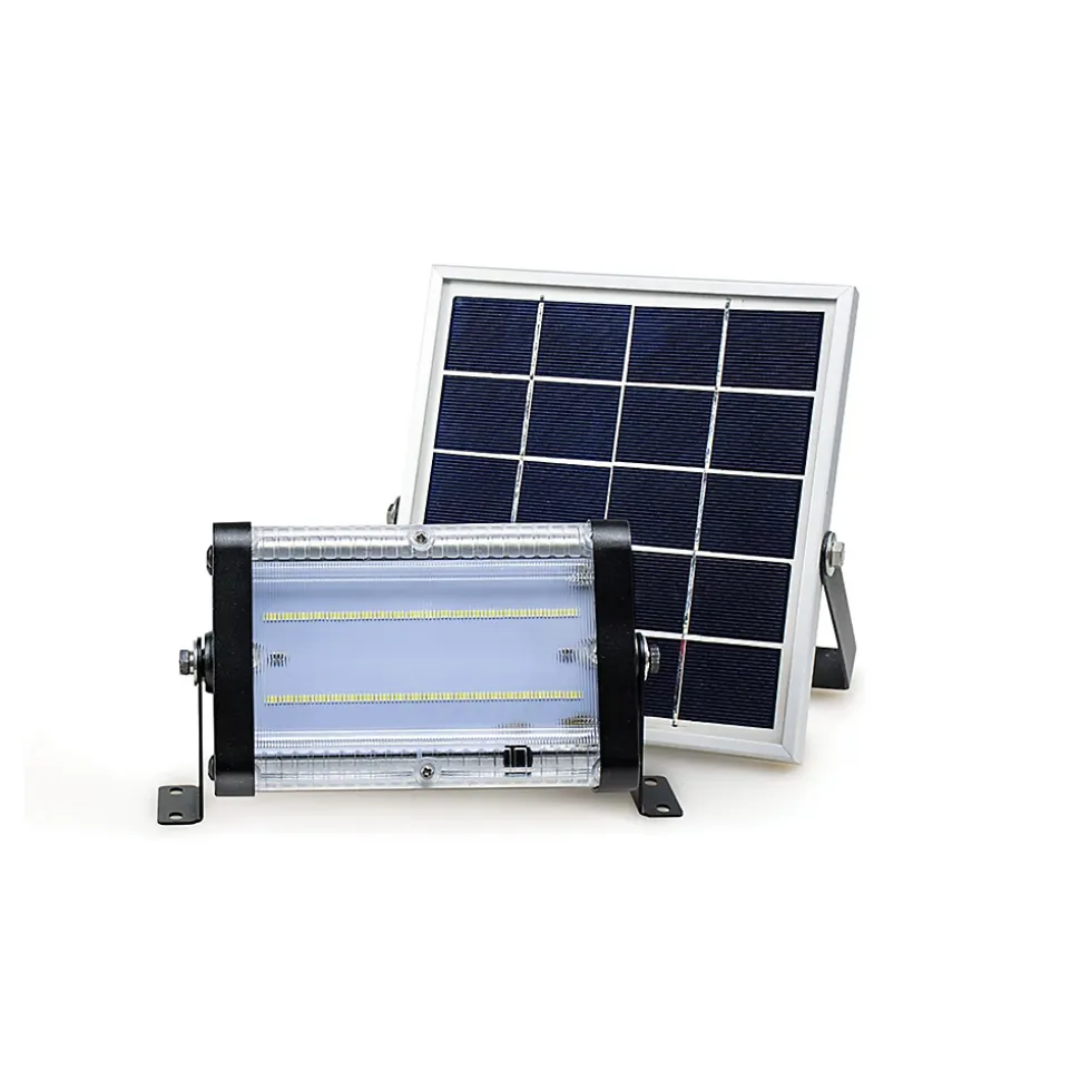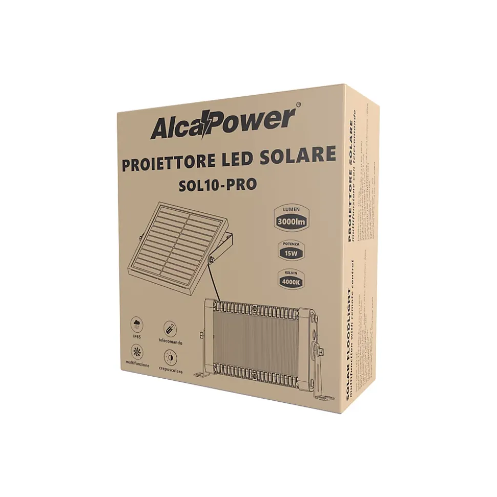 Projecteur LED solaire multifonction avec télécommande et batterie 3000lm avec jusqu’à 12h d’autonomie.Où puis-je utiliser le projecteur LED avec panneau photovoltaïque extérieur et batterie ?Ce projecteur LED avec panneau photovoltaïque extérieur et batterie Li-Ion est adapté pour une utilisation dans des environnements où l’électricité n’arrive pas. Il se compose d’un projecteur solaire avec 3,5 mètres de câble étanche et d’un panneau photovoltaïque pouvant être placé à distance. De cette façon, vous pouvez éclairer toutes les zones même difficiles à atteindre avec le soleil, comme les greniers, les garages, les remises, les cours ou les trottoirs. Très lumineux à puissance maximale. Grâce à la télécommande il est possible de varier l’intensité de la lumière et de l’allumer si nécessaire.Caractéristiques techniques :- Equipé de la technologie Adaptive Light System 2.0 (ALS2.0) qui garantit un fonctionnement jusqu’à 8 jours consécutifs par temps nuageux et pluvieux.- Equipé d’une télécommande.- Equipé de différents modes de fonctionnement.- Panneau solaire : 14V 5W.- Batterie : 3,7 V 5 200 mAh, 2xLi-Ion 18650.- Temps de charge de la batterie : environ 7 heures.- Autonomie de la batterie : >12 heures.- Seuil d’activation du capteur crépusculaire : 10lux.- Seuil de désactivation du capteur crépusculaire : 80lux.- Température de couleur : 4000K.- Flux lumineux : 3000lm.- Angle d’écoulement : 120°.- Cycles d’allumage : 25 000 cycles.- Durée de vie utile : 50 000 heures.- Degré de protection : IP65.- Hauteur d’installation : 2-5m- Longueur totale du câble : 3,5 mètres- Poids du phare : environ 545g.- Poids du panneau solaire : environ 505g