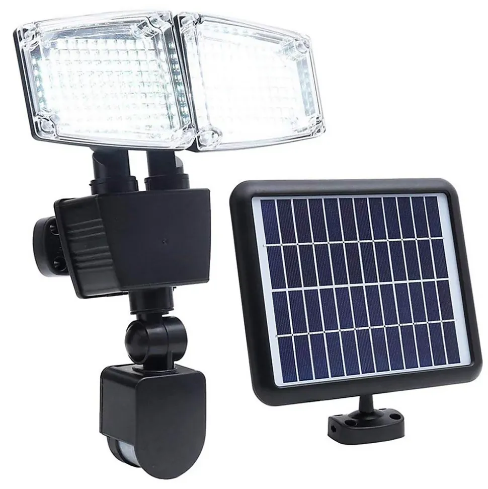 Projecteur solaire avec 2 têtes LED fournissant 1200 lumens pour un éclairage puissant. Équipé d’un détecteur de mouvement orientable et d’un interrupteur On/Off. Autonomie de 10 à 12h après 6-8h de recharge solaire. Matériaux durables en ABS et acier, résistant aux UV et aux intempéries. Installation rapide grâce aux vis et chevilles fournies. Économie d’énergie et longue durée de vie des LEDs de 50 000 heures.