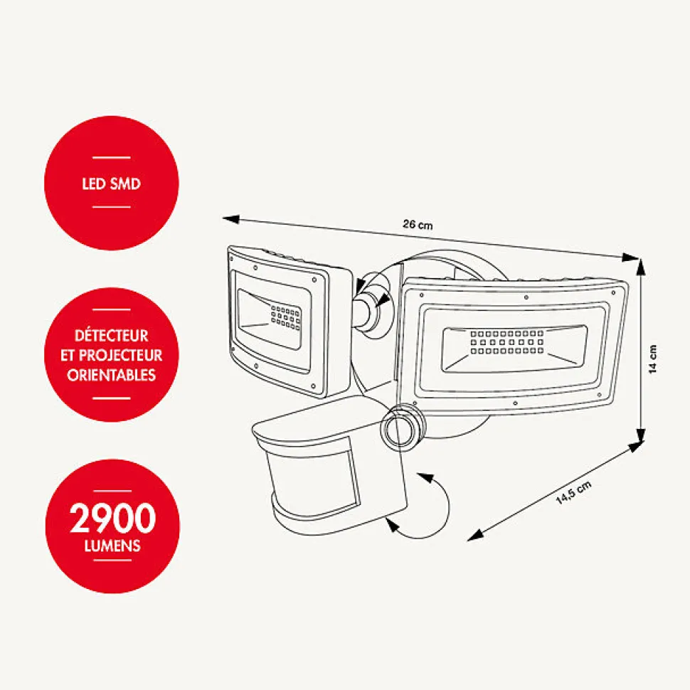 Très éclairant ! Ce projecteur noir à détection de mouvements de qualité professionnelle avec alarme de sécurité vous permettra d’éclairer vos extérieurs !• Couleur LED : Blanc• Couleur du produit : Noir• Nombre de LED : 56 LED• Luminosité : 2900 lumens• Dimensions : L25.6 x H20.6 x l14.3cm• Alimentation : sur secteur• Puissance : 36W• Tension : 230V• Projecteur à détection à 10m de portée, angle de 120°• Angle de détection : 240°• Matière : Aluminium• Garantie : 2 ansUsage & installation :L’indice IP44 vous garantit une étanchéité face à toutes météos.Données techniques :Le projecteur est composé de 56 LED SMD forte luminosité, à longue durée de vie. Il propose 3 modes de fonctionnement : mode détection 5sec, 1 min, 3min ou 10min d’allumage) ; mode forcé : vous permettant un éclairage en continu et un mode test. Le boîtier marche – arrêt – auto est protégé. Le détecteur de mouvements et le projecteur sont orientables en hauteur (ne se déclenche pas au passage d’un animal). L’angle de détection est de 240° et la distance de détection est de 10m, 15m ou 20m. Son angle de projection lumineuse est de 120°. Les accessoires de visseries sont fournis. Le projecteur est vendu sans prise, il doit être relié à votre installation électrique par des électriciens qualifiés, informés des normes et des exigences techniques de l’appareil et de son installation correcte.Source lumineuse :Le projecteur dispose de 56 LED d’une intensité de 2900 lumens.
