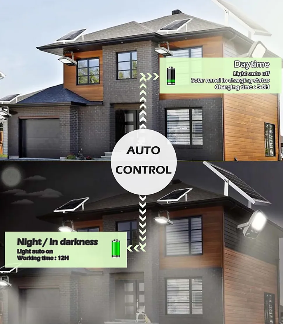 Projecteurs Extérieur LED 100W, Eclairage de Sécurité IP65 Étanche, Blanc Froid Lumineuse pour Jardin Cour Garage Patio Terrasse Entrepôt Arrière-cour [Classe énergétique A++]Puissance : 100 WLumière : 2 500 lm Température : 6400ºK (Lumière blanche – froid)Tension à puissance maximale : 6,0 VIntensité de puissance maximale : 2,5 A Circuit ouvert de tension : 7,08 V Intensité de coupe – Circuit : 2,6 A Type de LED : CMS Classe IP : IP65 ExtérieurCI : 08Angle d’ouverture : 120ºTaille du projecteur : 362.5 x 318.5 x H : 46 mm Mesure du panneau solaire : 350 x 350 x 17 mmCouleur du corps : NoirCouleur diffuseur : TransparentMatière : Aluminium et ABS Épaisseur du câble : 0,75 Gradateur (IC) : OuiTélécommande incluse : Oui Prend environ 10 heures à télécharger grâce à l’IC.Caractéristiques de la télécommande :Bouton Marche/Arrêt : Le projecteur LED s’allume en fonction de la lumière ambianteBouton OFF : active ou désactive le capteur de lumièreTouche 3H : Le projecteur s’allume pendant 3H et le processus se répète les jours successifs.Touche 5H : Le projecteur s’allume pendant 5H et le processus se répète les jours successifs.Touche 8H : Le projecteur s’allume pendant 8H et le processus se répète les jours successifs.Bouton de luminosité maximale : augmente la luminosité par intervalles de 20 % jusqu’à atteindre le maximum.Bouton de luminosité minimale : Diminue la luminosité par intervalles de 20 % jusqu’à ce qu’elle atteigne le minimum.Conforme aux certificats CE et RoHsGarantie 2 ans