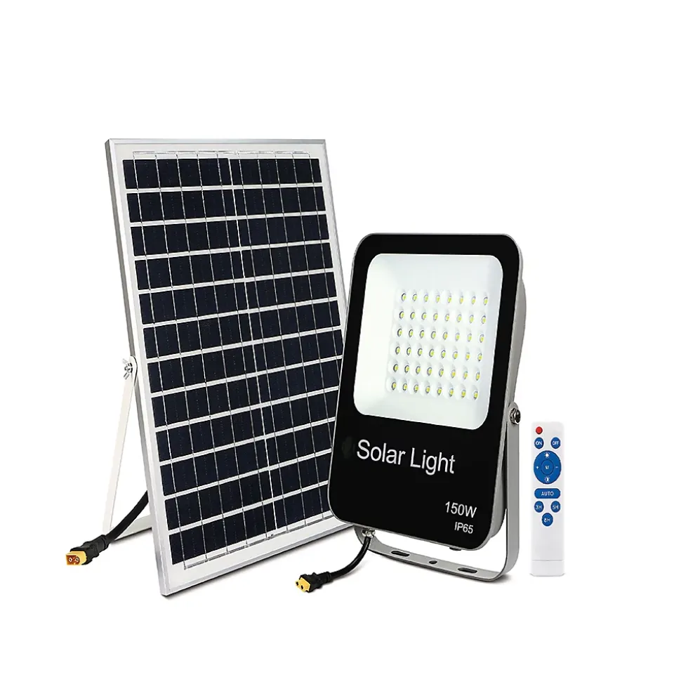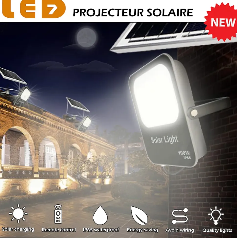 Projecteurs Extérieur LED 150W, Eclairage de Sécurité IP65 Étanche, Blanc Froid Lumineuse pour Jardin Cour Garage Patio Terrasse Entrepôt Arrière-cour [Classe énergétique A++]Puissance : 150 WLumière : 3 000 lm Température : 6400ºK (Lumière blanche – froid)Tension à puissance maximale : 6,0 VIntensité de puissance maximale : 2,5 A Circuit ouvert de tension : 7,08 V Intensité de coupe – Circuit : 2,6 A Type de LED : CMS Classe IP : IP65 ExtérieurCI : 08Angle d’ouverture : 120ºTaille du projecteur : 362.5 x 318.5 x H : 46 mm Mesure du panneau solaire : 350 x 350 x 17 mmCouleur du corps : NoirCouleur diffuseur : TransparentMatière : Aluminium et ABS Épaisseur du câble : 0,75 Gradateur (IC) : OuiTélécommande incluse : Oui Prend environ 10 heures à télécharger grâce à l’IC.Caractéristiques de la télécommande :Bouton Marche/Arrêt : Le projecteur LED s’allume en fonction de la lumière ambianteBouton OFF : active ou désactive le capteur de lumièreTouche 3H : Le projecteur s’allume pendant 3H et le processus se répète les jours successifs.Touche 5H : Le projecteur s’allume pendant 5H et le processus se répète les jours successifs.Touche 8H : Le projecteur s’allume pendant 8H et le processus se répète les jours successifs.Bouton de luminosité maximale : augmente la luminosité par intervalles de 20 % jusqu’à atteindre le maximum.Bouton de luminosité minimale : Diminue la luminosité par intervalles de 20 % jusqu’à ce qu’elle atteigne le minimum.Conforme aux certificats CE et RoHsGarantie 2 ans