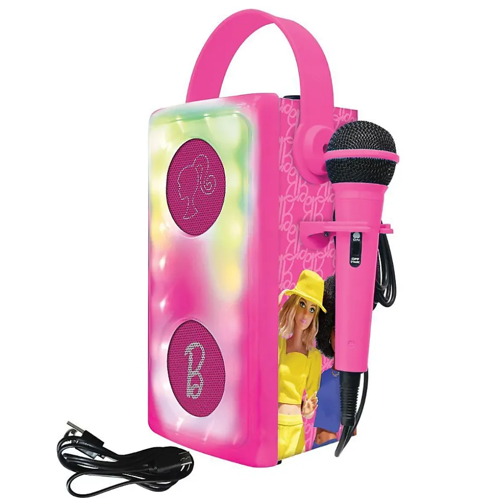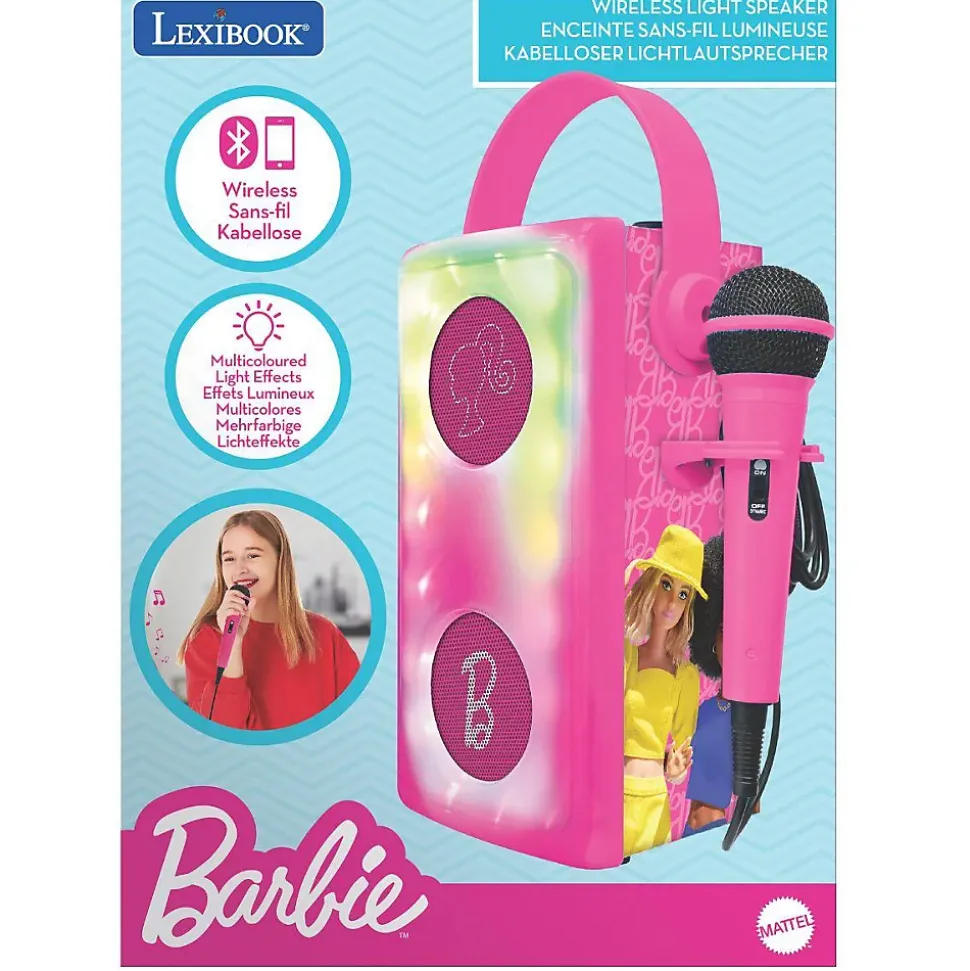 Magnifique Enceinte Bluetooth lumineuse avec micro Barbie• 2 puissants haut-parleurs avec des effets lumineux multicolores • Fonctionne via Bluetooth mais également avec une carte SD/TF, une clé USB ou un câble Aux-in (câble inclus) • Micro inclus avec boutons de contrôle du volume et de l’écho• Batterie rechargeable via port USB type C (câble inclus)• Anse pour karaoké facile à transporter