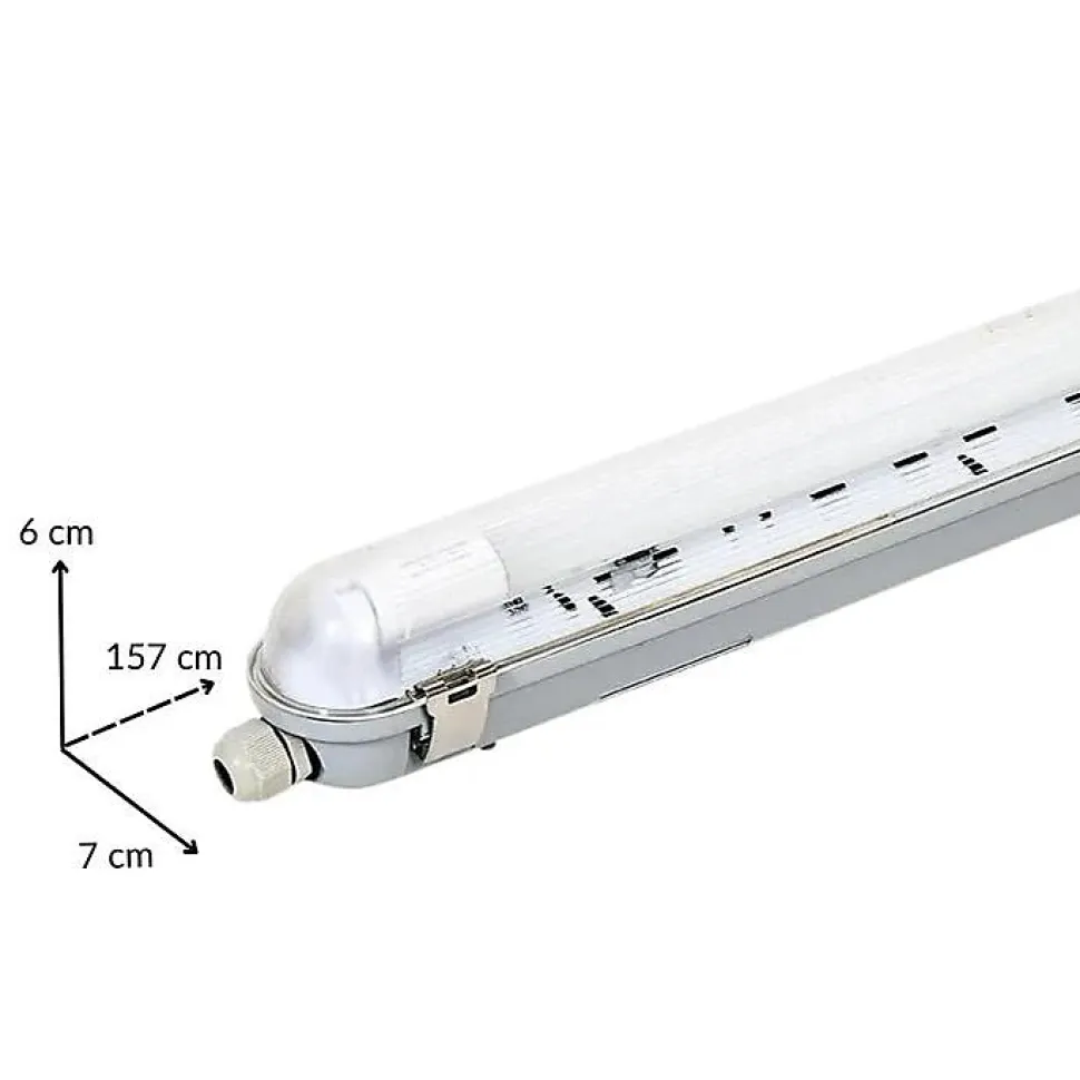Réglette étanche 150 cm IP65 pour 1 tube LED T8 (boîtier vide – pack de 6) : le support de relamping industriel idéal pour sécuriser les zones humides/poussiéreuses, avec alimentation 1 côté et raccordement 220-240V conforme (CE/RoHS).Confort visuel & uniformité avec la réglette étanche 150 cm T8 (diffusion 180°)Cette réglette pour tube LED T8 étanche 150cm vous permet de choisir le tube (Kelvin, flux, IRC) selon l’usage tout en gardant une diffusion large grâce à un angle 180°. Résultat : un éclairage linéaire homogène, particulièrement pertinent en circulations, zones de stockage, ateliers, garages et parkings couverts, où la lisibilité et la sécurité priment.Rénovation express & pose saillie : réglette IP65 150 cm « alimentée 1 côté »Conçue pour une installation en saillie, la réglette LED (157 x 7 x 6 cm) se fixe rapidement puis se raccorde au secteur AC 220-240V. Le vrai gain de temps chantier, c’est la logique « alimenté 1 côté » : câblage simplifié, moins d’erreurs de sens au montage, et relamping plus rapide en série sur sites industriels ou locaux techniques.Performance & ROI : boîtier vide IP65 + tube T8 LED au choix (optimisation stock & kWh)En version boîtier vide, vous standardisez le support (IP65) et vous pilotez la performance via le tube LED T8 150 cm installé : puissance, flux, température de couleur selon le cahier des charges. Côté ROI, c’est une stratégie pro : moins de références en stock, remplacement rapide du tube en maintenance, et baisse de consommation vs anciennes installations fluorescentes (selon tube choisi), sans changer tout le luminaire.Durabilité & normes : IP65, PVC, -20°C à +40°C (maintenance réduite) + sécurité 220-240VIndice IP65 pour encaisser poussières et projections d’eau, boîtier PVC, fonctionnement -20°C à +40°C, durée de vie annoncée ~25 000 h, certifica