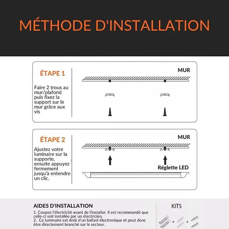 - [Éclairage et luminosité] La réglette dispose d’une puissance de 30W pour émettre un flux lumineux de 4500lm répandu sur un angle d’éclairage immense de 120°. Tous ces atouts font de la réglette LED un luminaire pertinent pour votre pièce. Sa lumière est optimale et instantanée dès son allumage, sans éblouir les yeux de son usager.